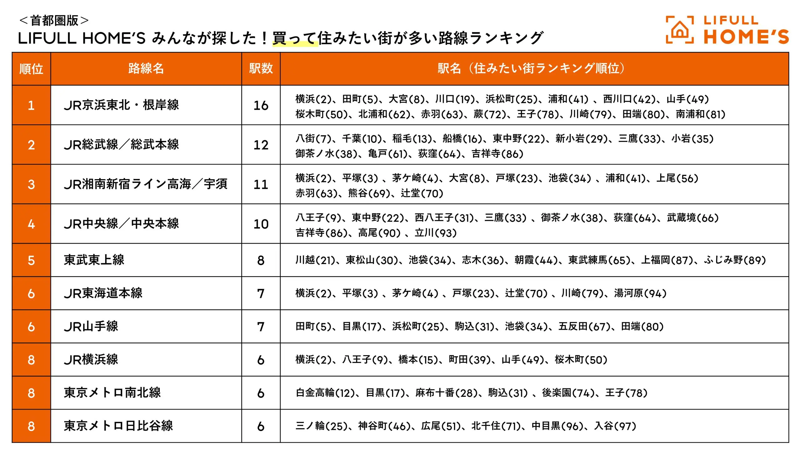 <首都圏版> LIFULL HOME'S みんなが探した!住みたい街が多い「路線」ランキングを初めて発表