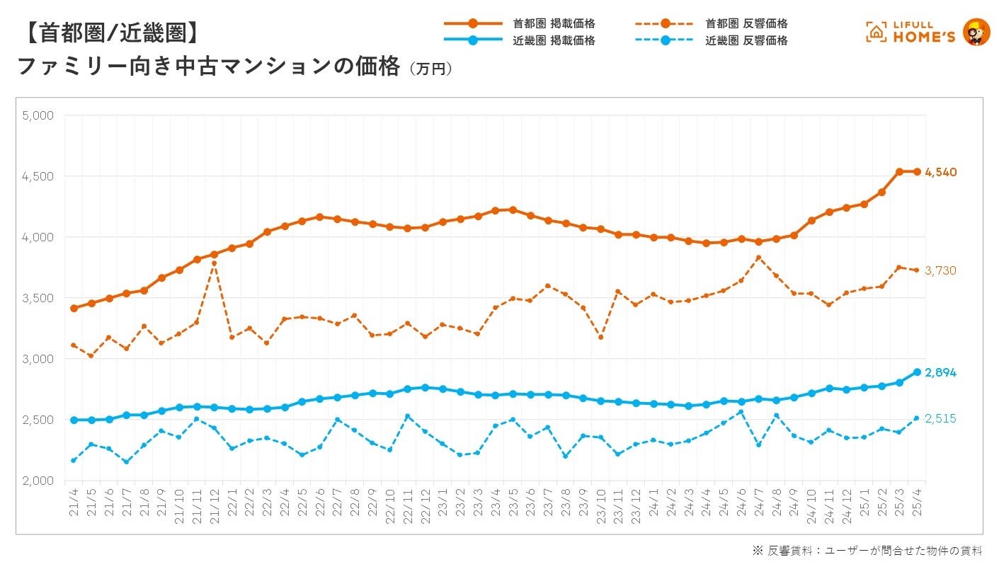 ファミリー向き中古マンションの平均掲載価格は、首都圏で前月から横ばいの4,539万円(前年同月比114.8%)、近畿圏で過去最高の2,894万円(前年同月比110.1%)となりました。近畿圏では特に、大阪市中心6区が8,045万円で前年比153.2%と近畿圏の価格上昇を牽引しています。なお、大阪市中心6区では平均掲載平米単価が1,122,110円で前年比147.3%と大きく上昇しています。これは、東京都心6区(1,879,569円・前年同月比138.9%)と比較しても高い上昇率となっています。