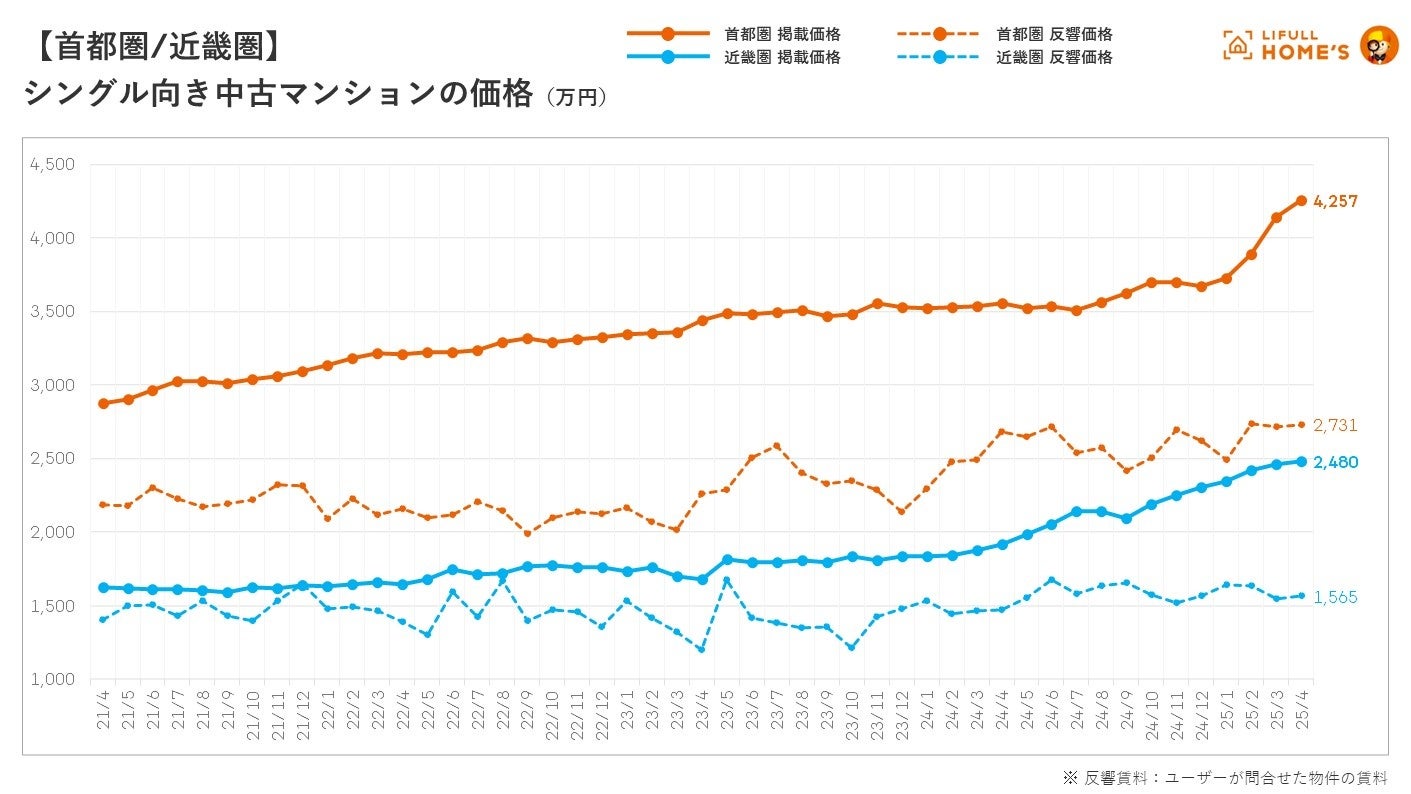 シングル向き:首都圏、近畿圏ともに過去最高*1価格を更新。大阪市中心部では前年比160.8%と大幅アップ