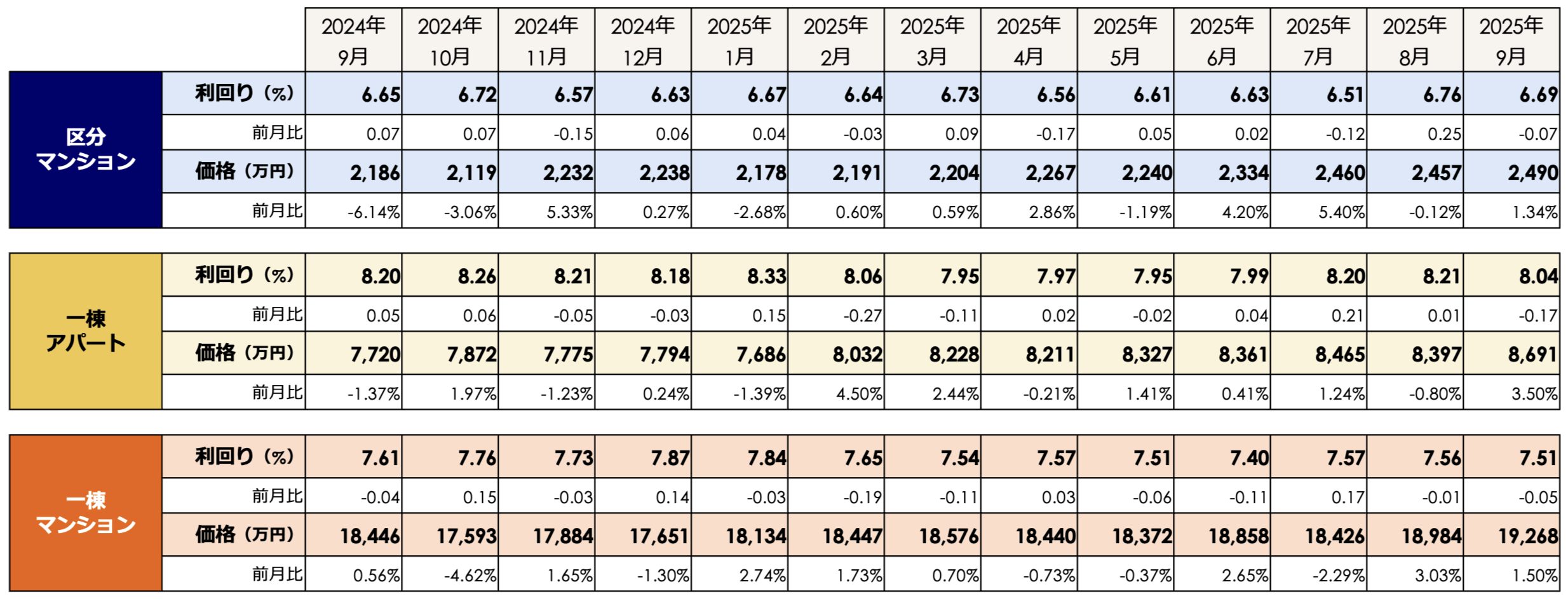 2025年9月1日~9月30日に健美家で登録・掲載された全国の住宅系収益不動産3種別(区分マンション・一棟アパート・一棟マンション)