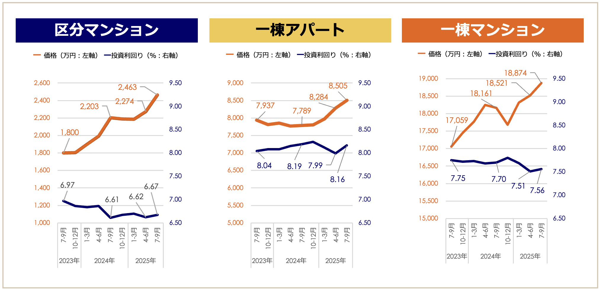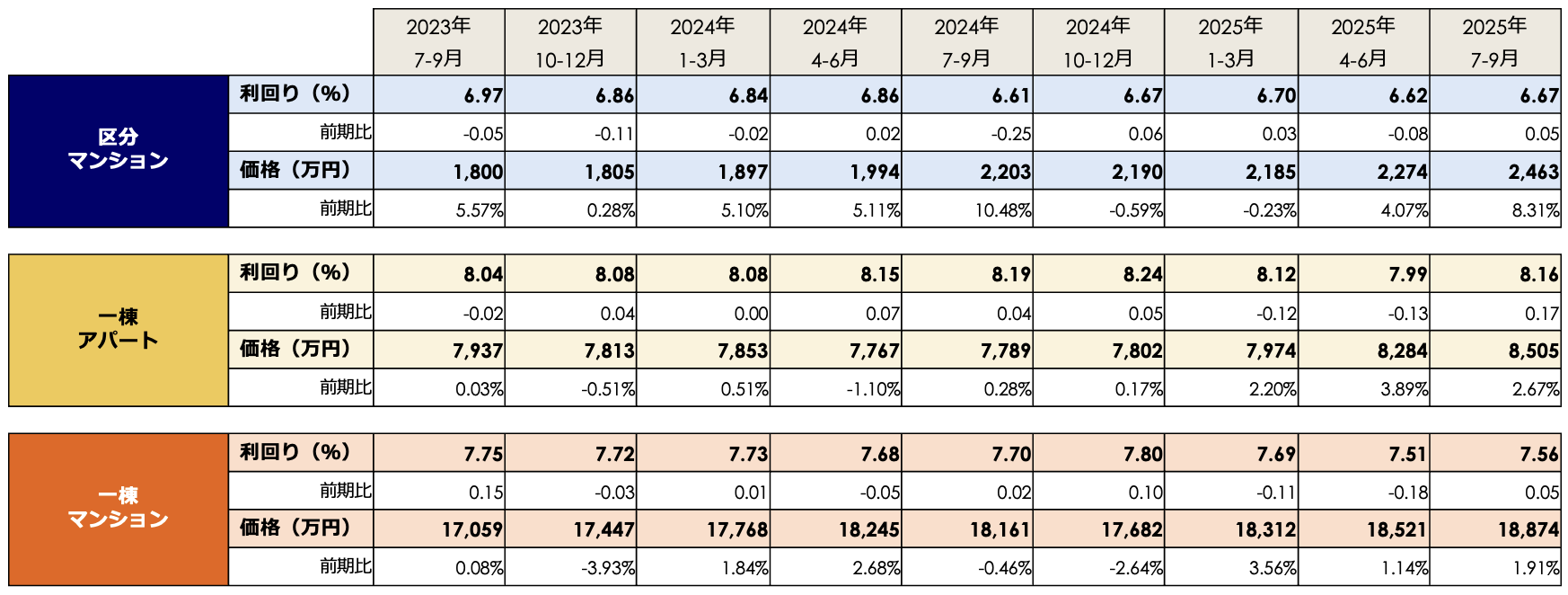 収益物件、全種別で価格・利回り共に上昇。 区分マンション価格は前期比+8.3%の2,463万円に。 「収益物件 市場動向四半期レポート」2025年7月~9月期