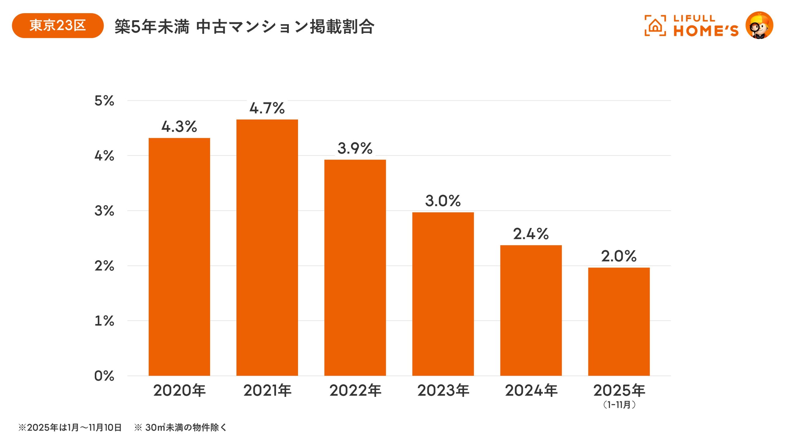 築5年未満の中古マンション掲載割合を調査したところ、2021年から減少傾向にあることが分かりました。新築マンション供給数が減少するなか、市場に出てくる築浅マンションの数も減少しています。価格高騰も相まって、築浅マンションは手が届きづらい状況になりつつあります。