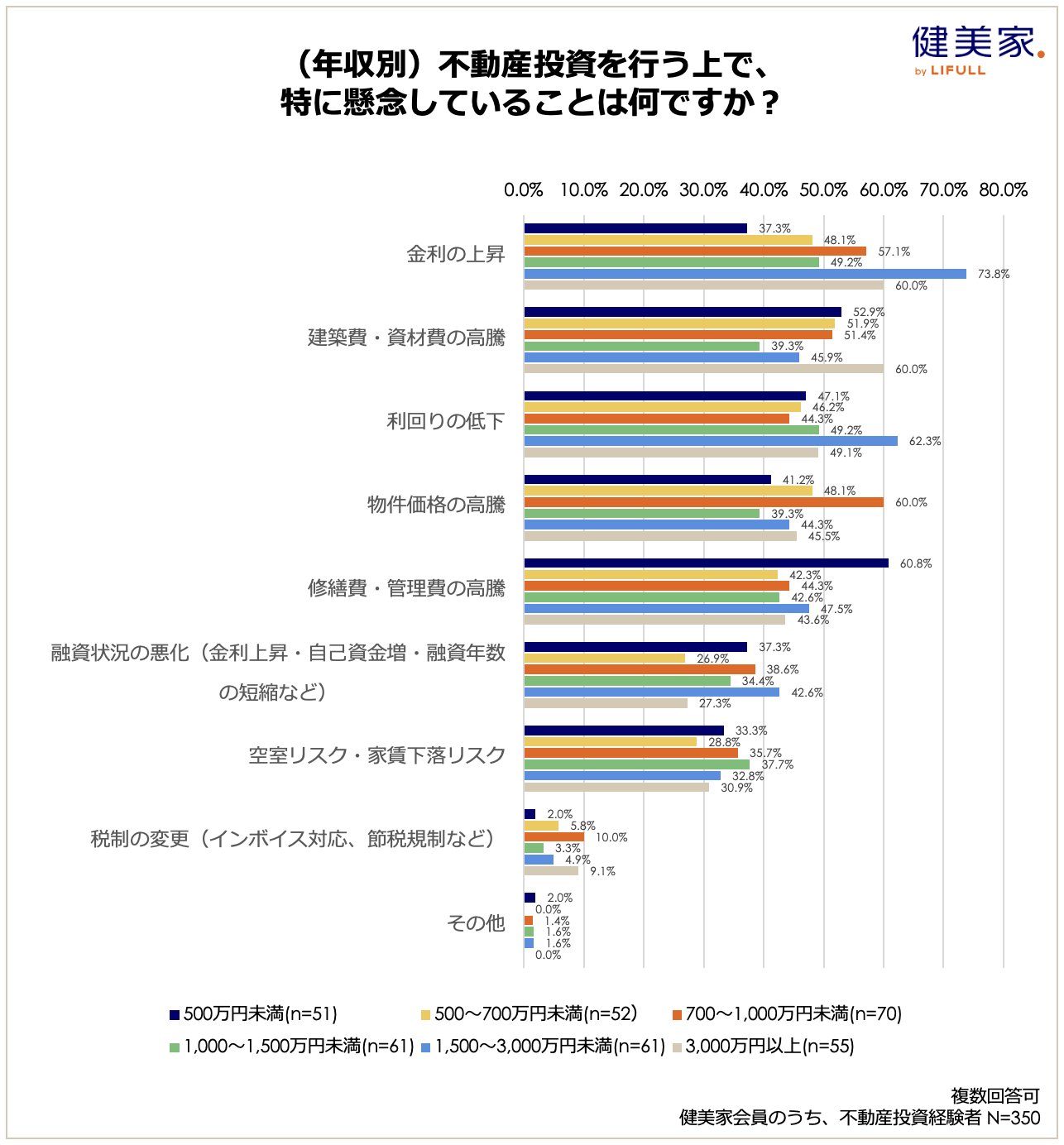 - 不動産投資上の懸念事項:年収500万円未満では「修繕費・管理費の高騰」(60.8%)がもっとも高く、「金利の上昇」(37.3%)は全体より低い。年収700〜1,000万円未満では「物件価格の高騰」(60.0%)が最大。