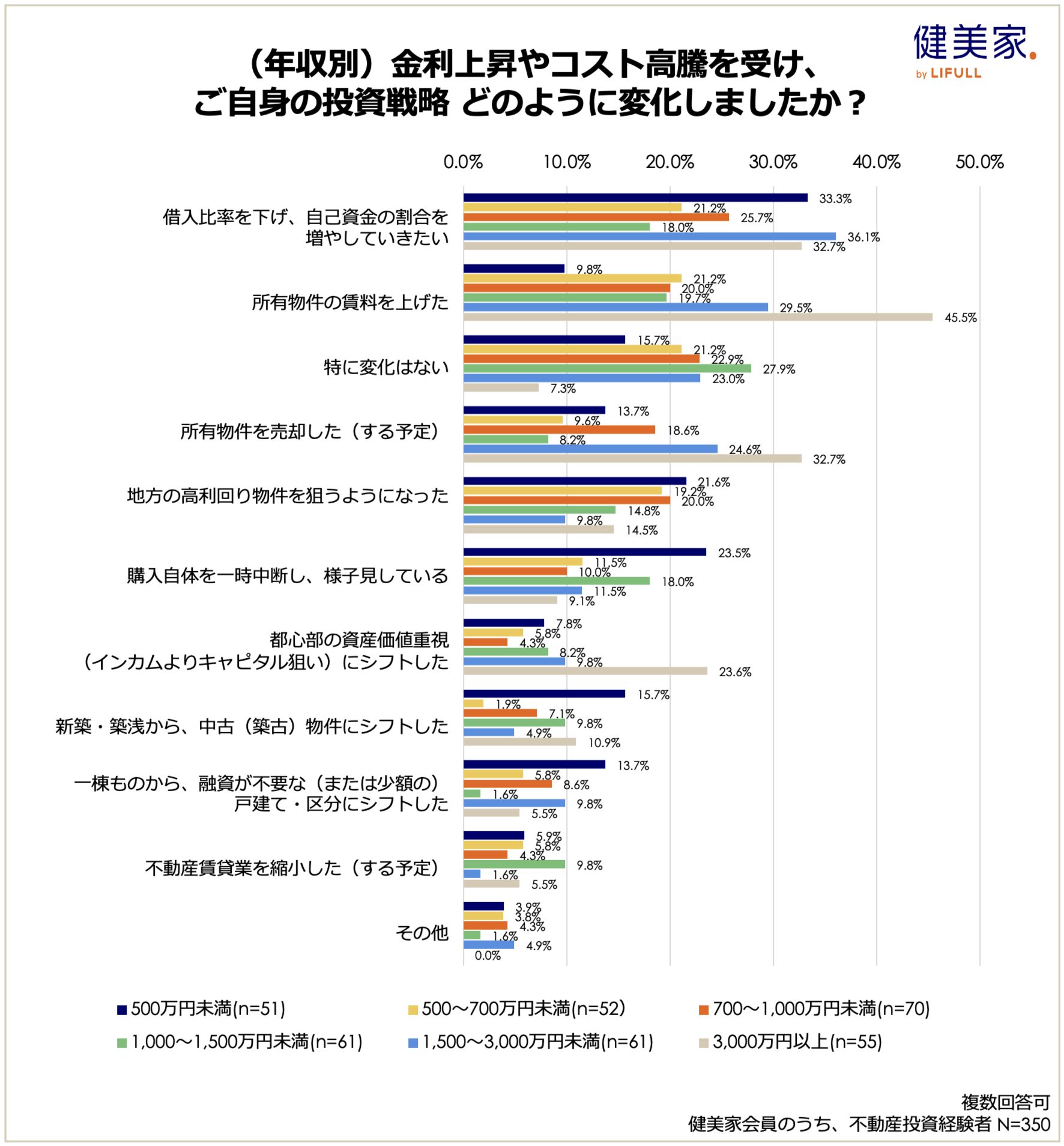 - 投資戦略の変更:年収1,500〜3,000万円未満では「借入比率を下げ自己資金を増やしたい」(36.1%)、「賃料を上げた」(29.5%)、「売却した(する予定)」(24.6%)が全体より高く、年収3,000万円以上では「賃料を上げた」(45.5%)、「売却した(する予定)」(32.7%)、「都心の資産価値重視にシフト」(23.6%)が目立つ。