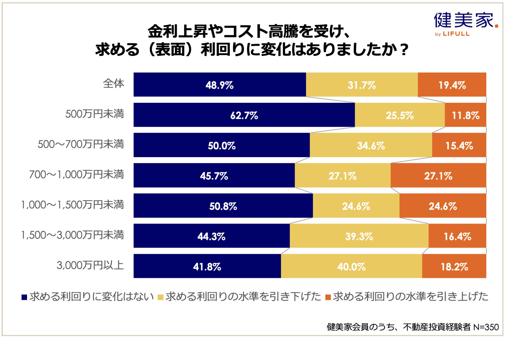 - 求める利回り:年収500万円未満では「変化はない」(62.7%)が6割超で最多。