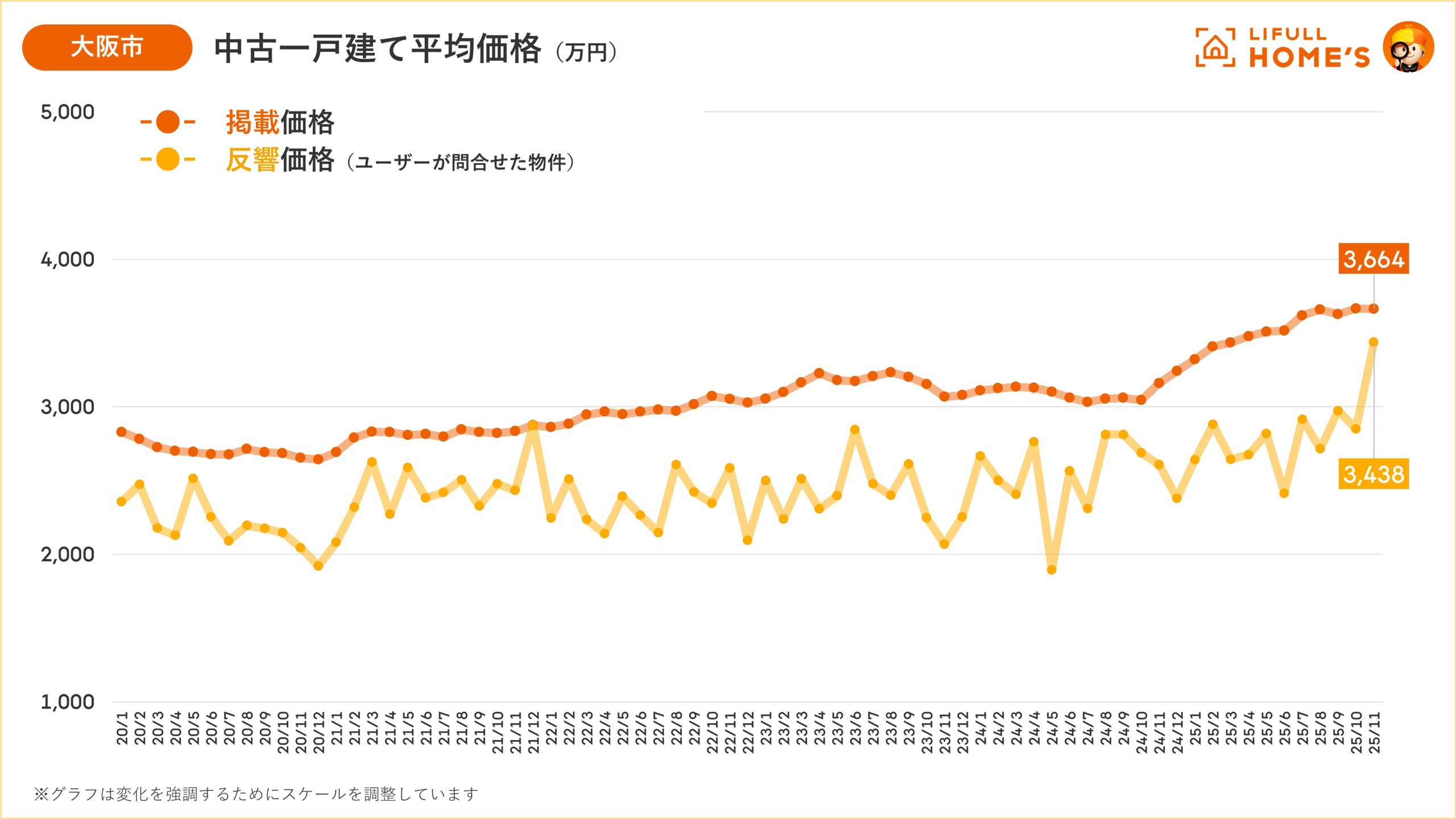 - 大阪市の掲載価格は3,664万円(前年同月比115.9%)、反響価格は3,438万円(前年同月比131.9%)で過去最高を更新