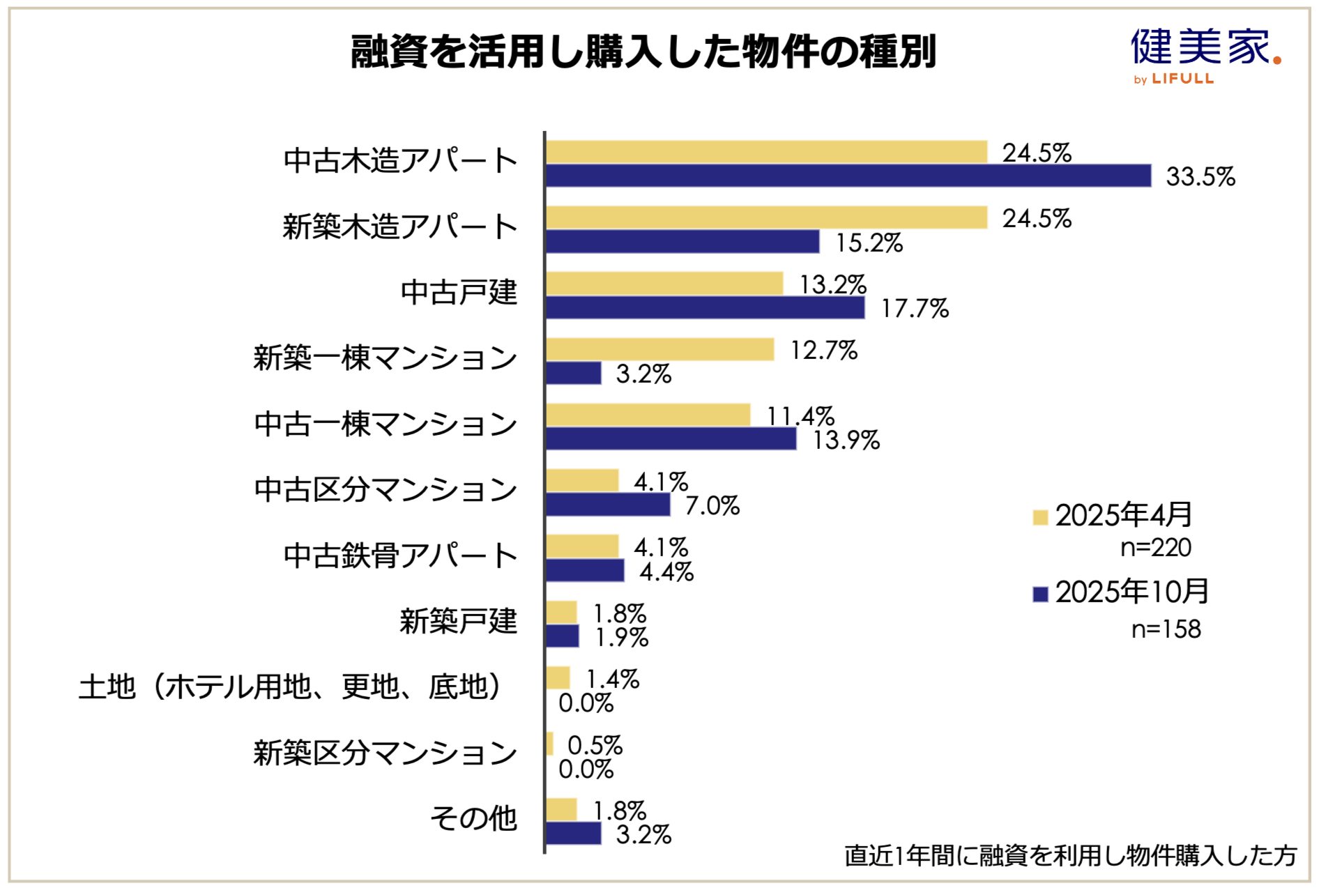 - 融資を活用した購入物件は「中古木造アパート」が33.5%(前回24.5%)で最多。前回同率1位だった「新築木造アパート」(今回15.2%)に2倍以上の差をつけた。