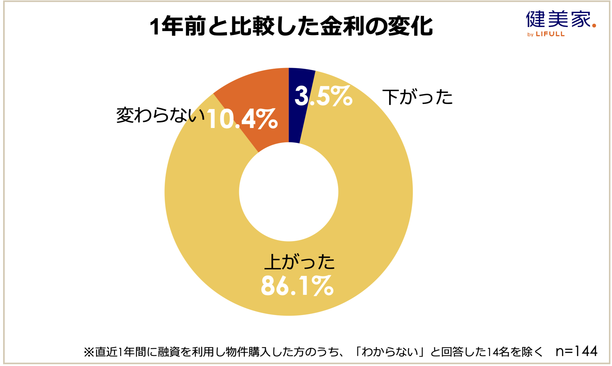 現在の投資用不動産の価格について、1年前と比べるとどうか尋ねたところ、「価格が上昇している」と回答した割合は77.9%に達し、前回から15.1ポイント増加しました。また、融資を活用した投資家に金利は1年前と比べて変化したか尋ねたところ、86.1%が「上がった」と回答しており、価格と金利のダブル上昇を強く実感する市況となっています。