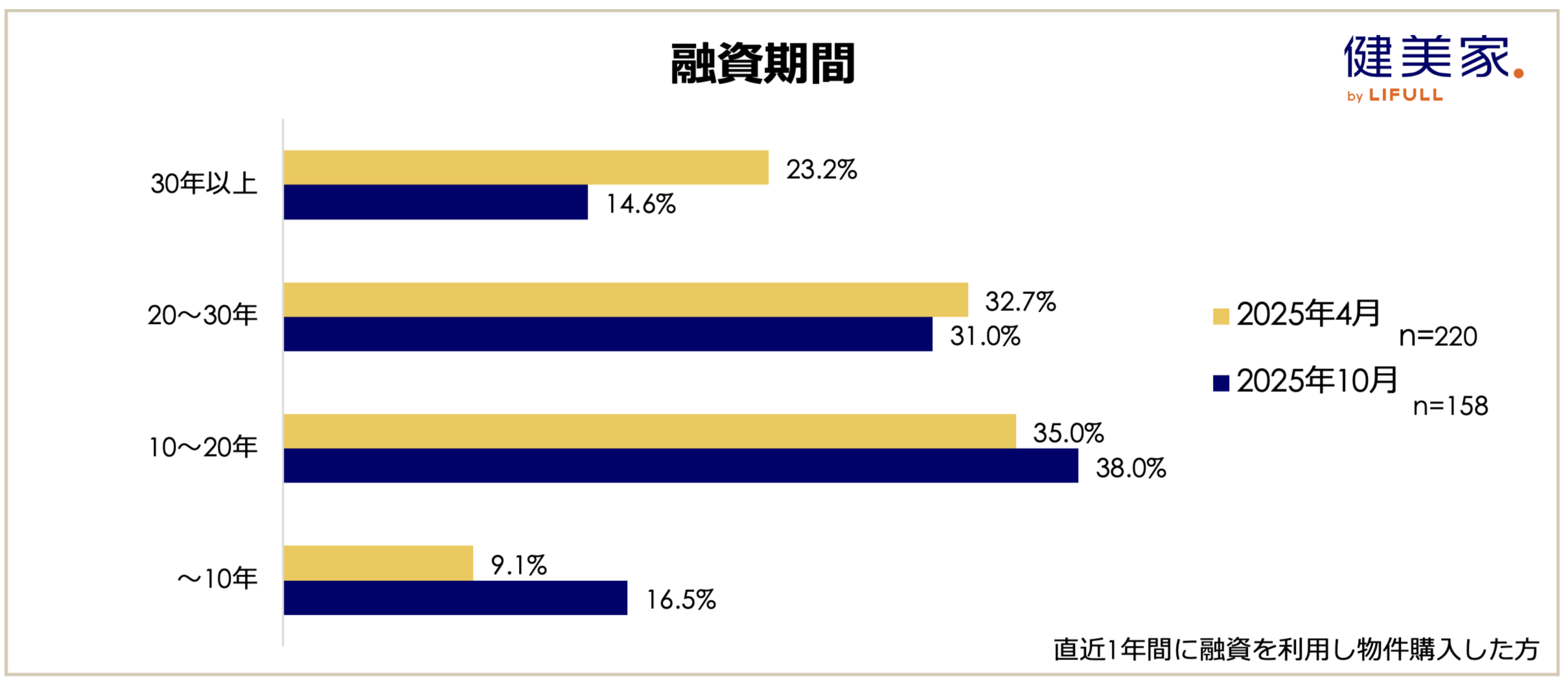 - 融資期間は「10~20年」が38.0%で最多。前回で23.2%だった「30年以上」は8.6ポイント減少し、「10年未満」は7.4ポイント増加するなど、短期化の傾向が見られた。