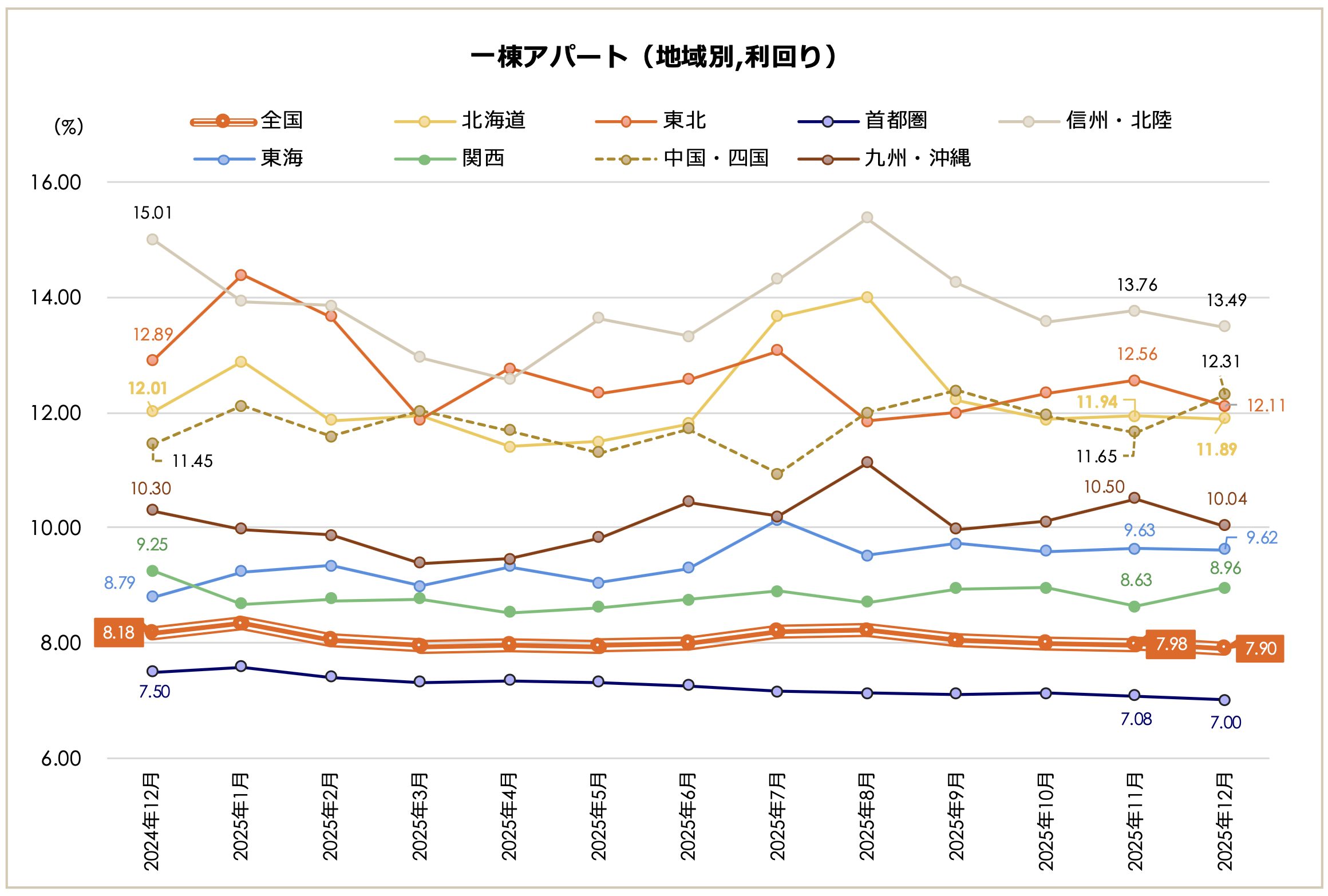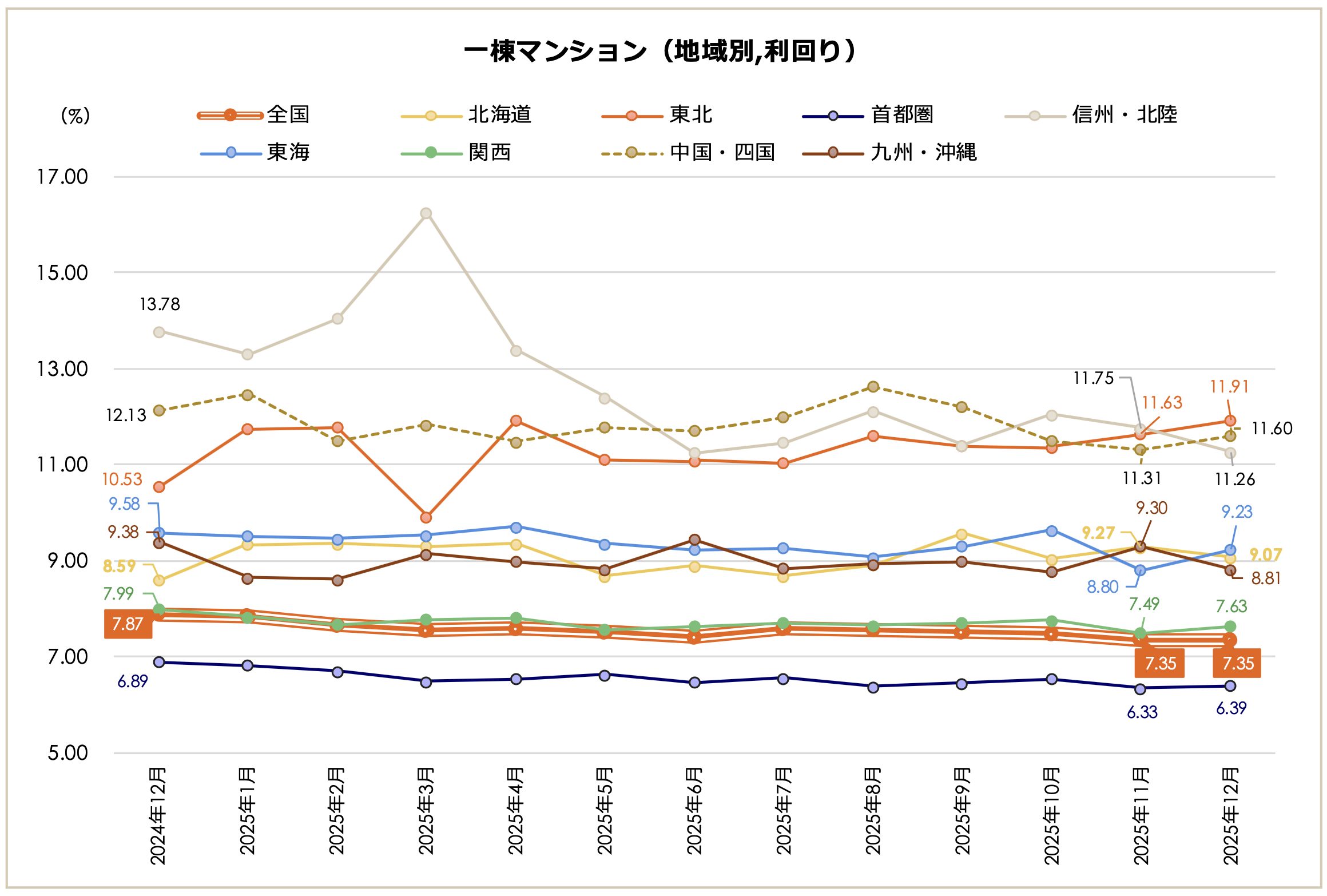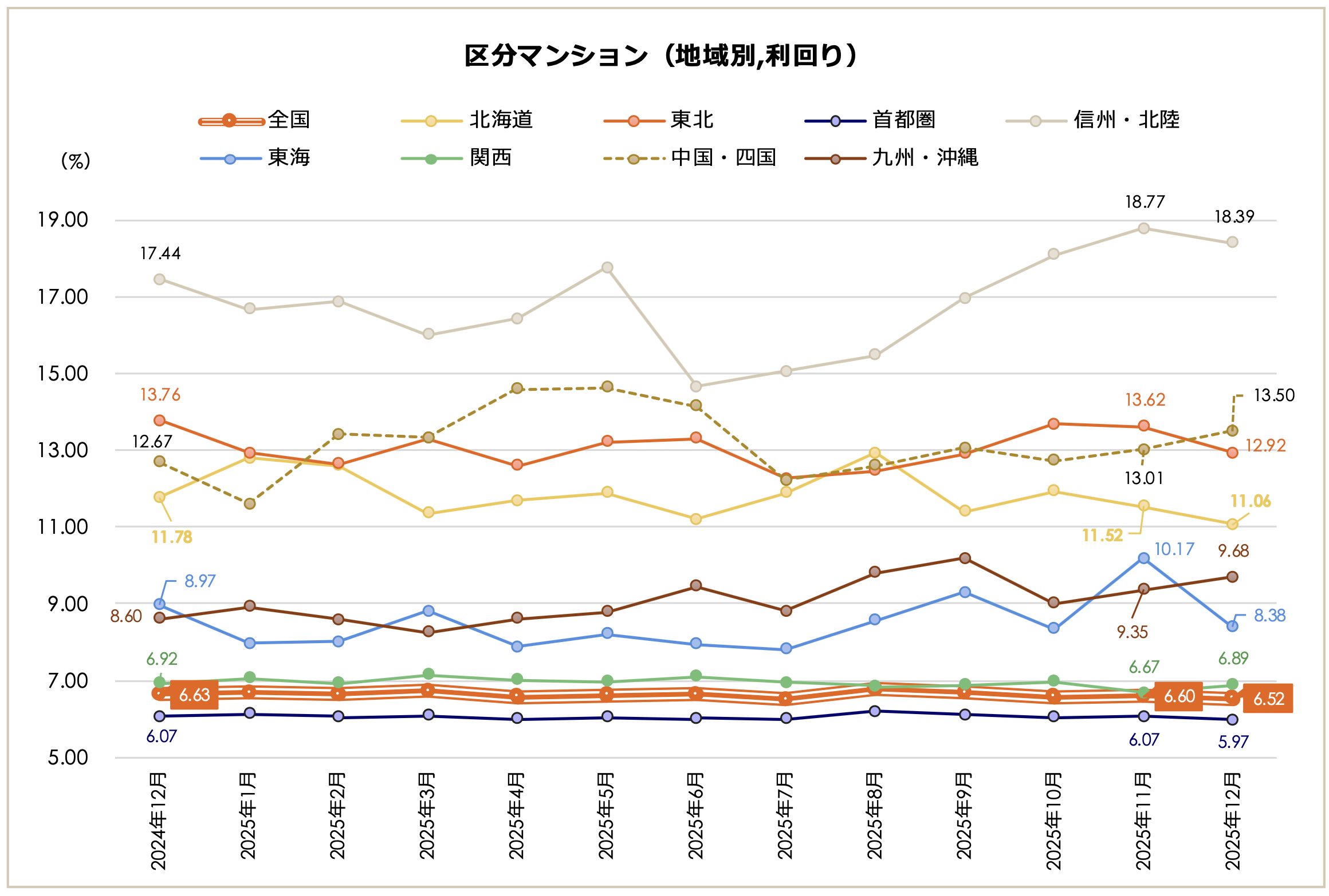地域別の利回りを見ると、平均価格が大きく上昇した形となった東海で前月比-1.79ポイントとなったほかは小幅な変動にとどまり、全体としては落ち着いた数字となりました。前年同月比では、北海道(-0.72ポイント)と東北(-0.84ポイント)が下落する一方で、信州・北陸(+0.95ポイント)、中国・四国(+0.83ポイント)、九州・沖縄(+1.08ポイント)は上昇しており、地域差が見られました。