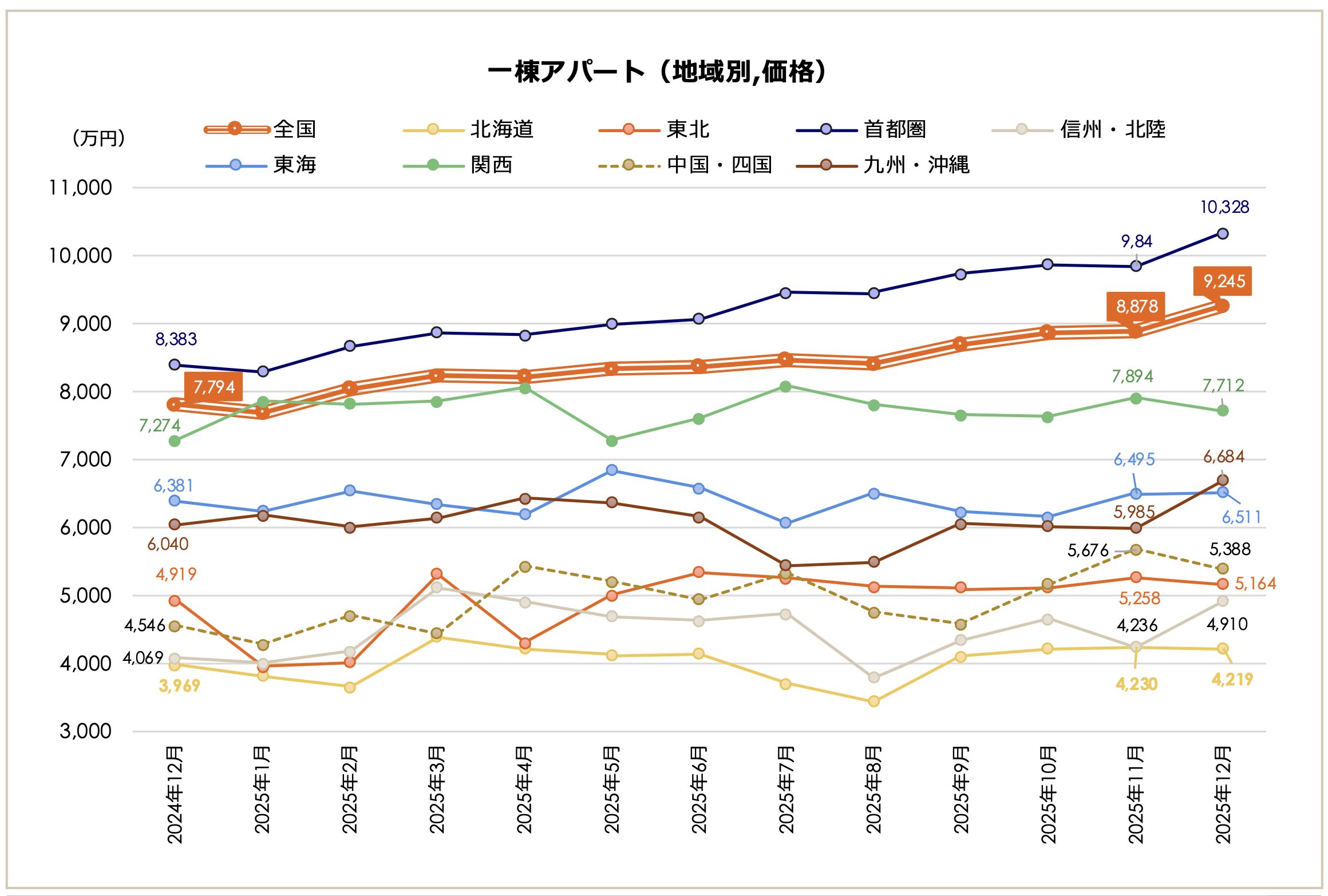 2025年12月期の一棟アパート市場(全国平均)は、価格が9,245万円となり、2005年1月以降、初めて9,000万円を突破しました。前月比+4.13%、前年同月比も+18.62%で上昇傾向を見せています。一方、利回りは、前月比-0.08ポイント、前年同月比-0.28ポイントと、ほぼ横ばいとなりました。