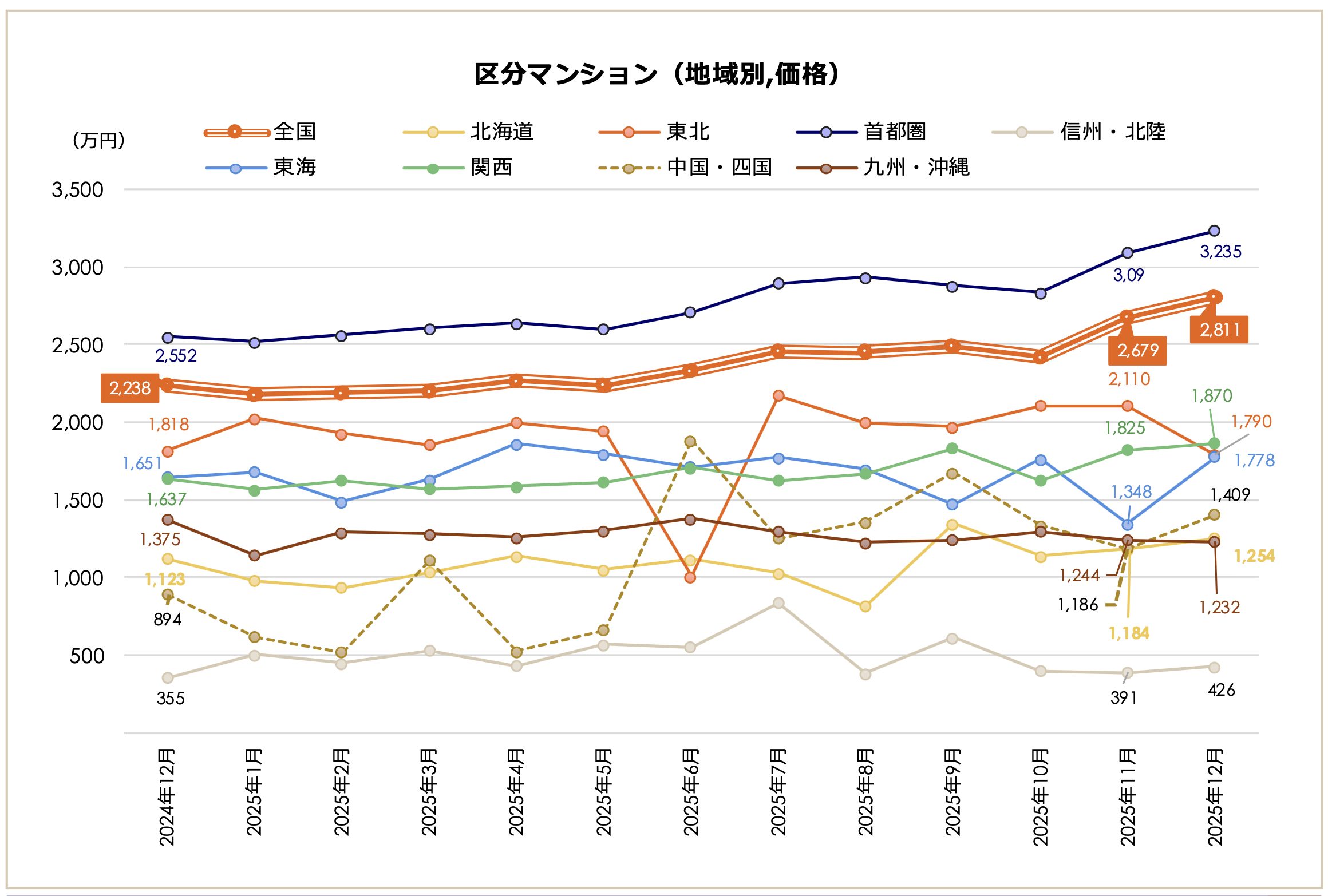 2025年12月期の区分マンション市場(全国平均)は、価格の上昇傾向が続きました。全国平均価格は2,811万円で、前月比で+4.93%の上昇。前年同月比でも+25.60%と、引き続き高い水準を維持しています。一方、全国平均利回りは6.52%で、前月比-0.08ポイント、前年同月比でも-0.11ポイントとほぼ横ばいの状態が続いています。