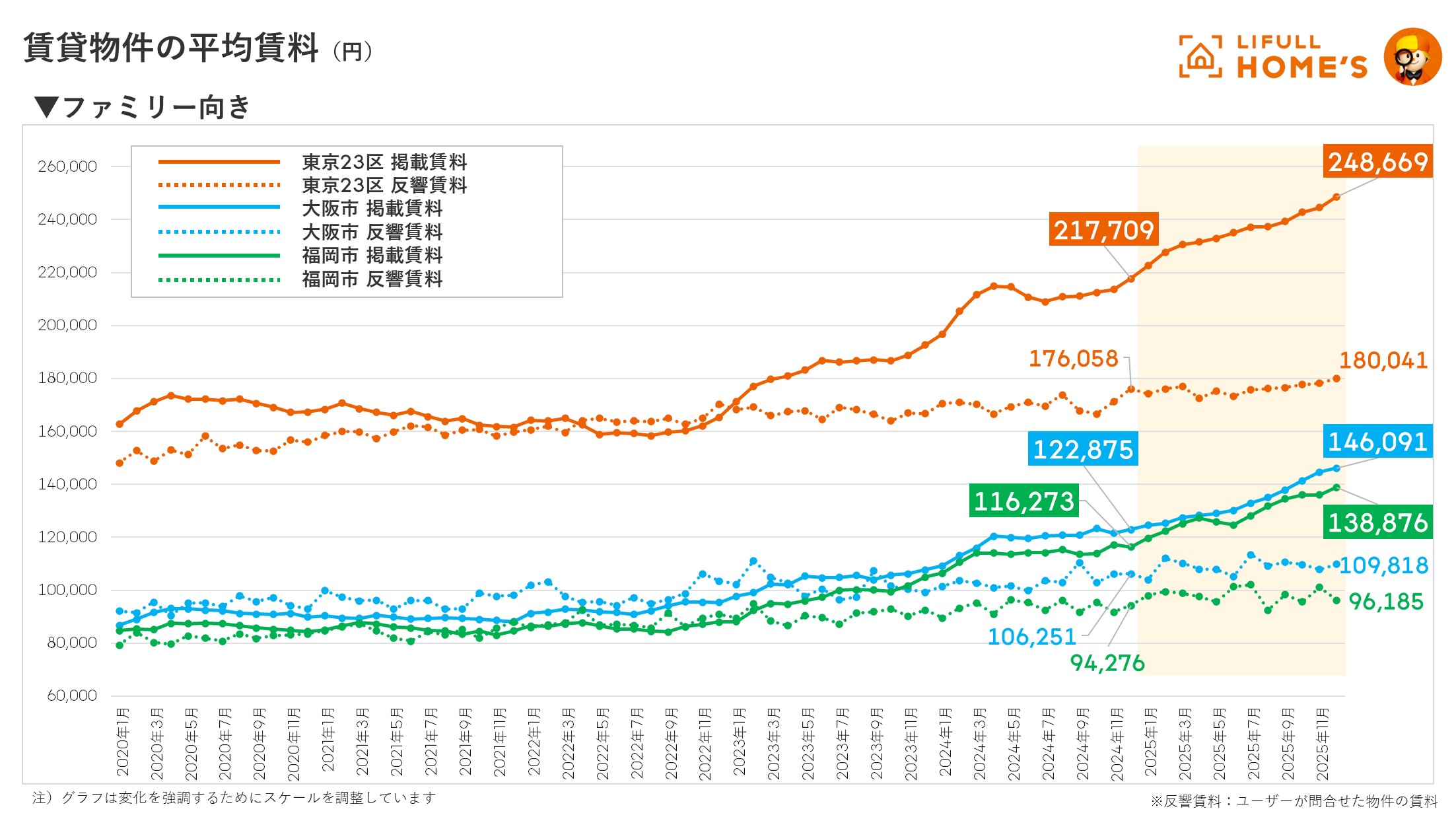 一方、シングルと比べて時季による需要の変化が小さいファミリー向き賃貸物件では年間を通じて掲載賃料の上昇が継続し、東京23区では2024年12月の217,709円から2025年12月の248,669円へと1年で14.2%上昇しました。前年の上昇率は13.0%であり、シングル向きとは異なり前年と同程度の上昇率を維持しています。また大阪市では、2024年12月の122,875円から2025年12月の146,091円へと、1年で18.9%上昇し、東京23区の上昇率を上回りました。