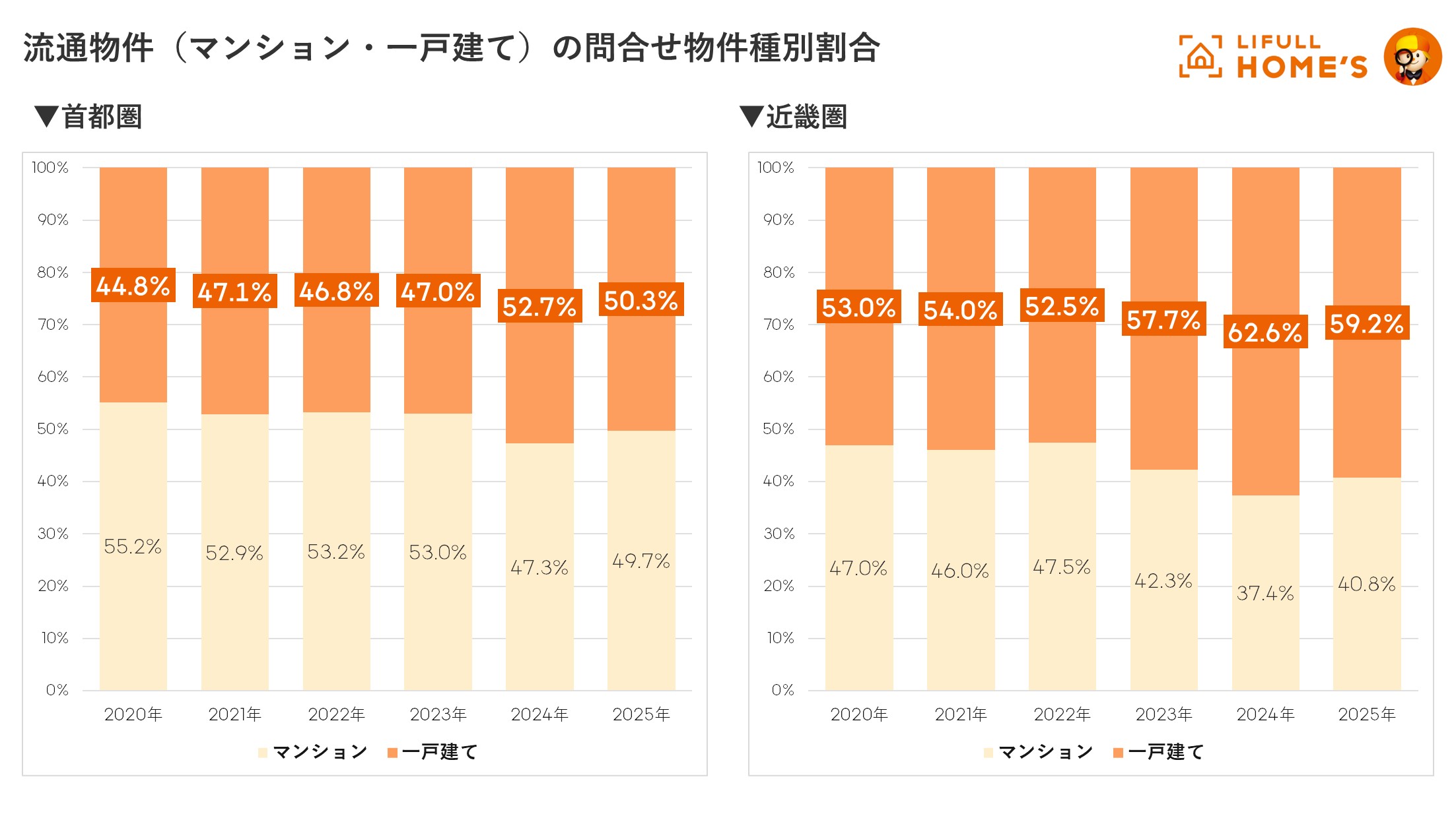 中古一戸建ての掲載価格は、首都圏、近畿圏ともに上昇傾向にありますが、その上昇率は中古マンションと比べると緩やかで、一戸建てとマンションの価格差は拡大しています。こうした状況を背景に、LIFULL HOME'Sに掲載された首都圏のファミリー向き流通物件に対するユーザーからの問合せのうち、一戸建てが占める割合が2024年以降明らかに増加しています(2020年:44.8%→2024年:52.7%)。2025年は50.3%とやや揺り戻しがあったものの、例年と比べると依然として一戸建ての需要は高く、購入ニーズの一戸建てシフトが定着しつつあるといえます。首都圏より比較的安価に土地を購入できることからもともと一戸建ての需要が高い近畿圏においても、問合せに占める一戸建ての割合は拡大(2020年:53.0%→2025年:59.2%)しています。