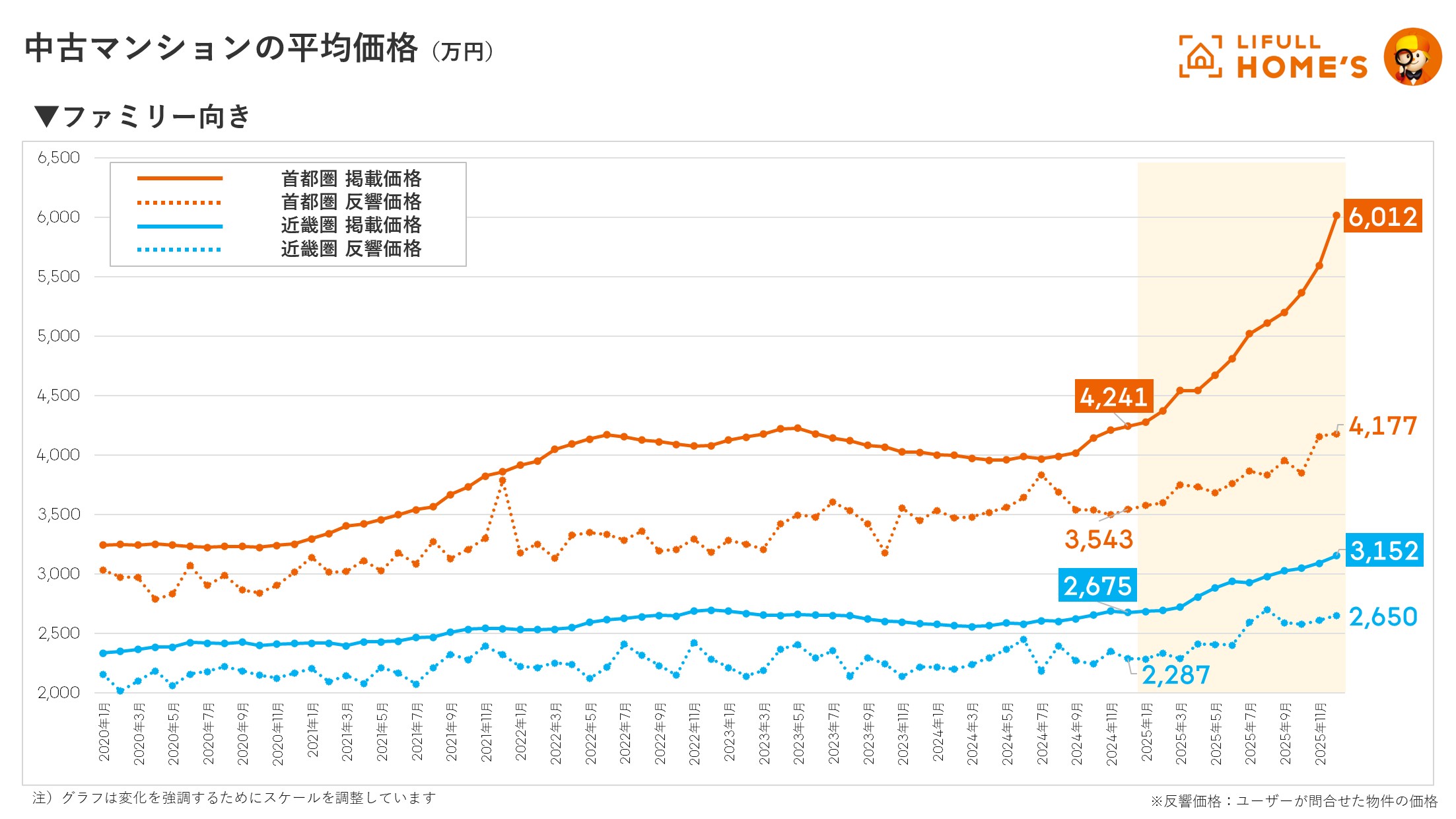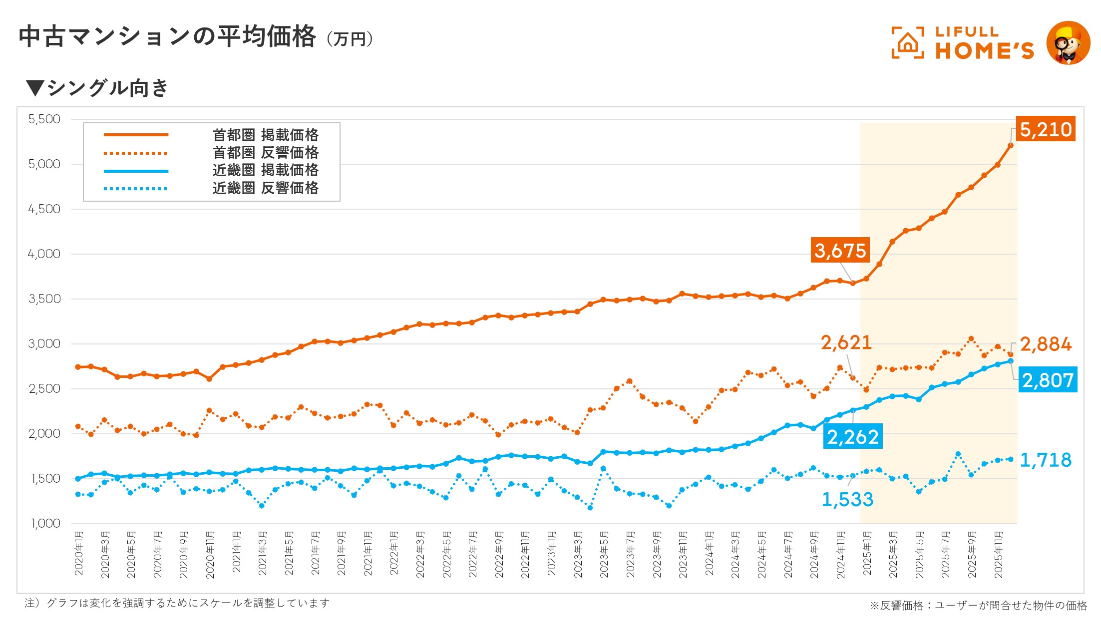 2025年12月の中古マンションの掲載価格は、首都圏(東京都、神奈川県、埼玉県、千葉県)シングル向き5,210万円(前年同月比+41.8%)、ファミリー向き6,012万円(同+41.8%)、近畿圏(大阪府、兵庫県、京都府)シングル向き2,807万円(同+24.1%)、ファミリー向き3,152万円(同+17.8%)となり、いずれも2020年の計測開始以降の最高値を更新しました。