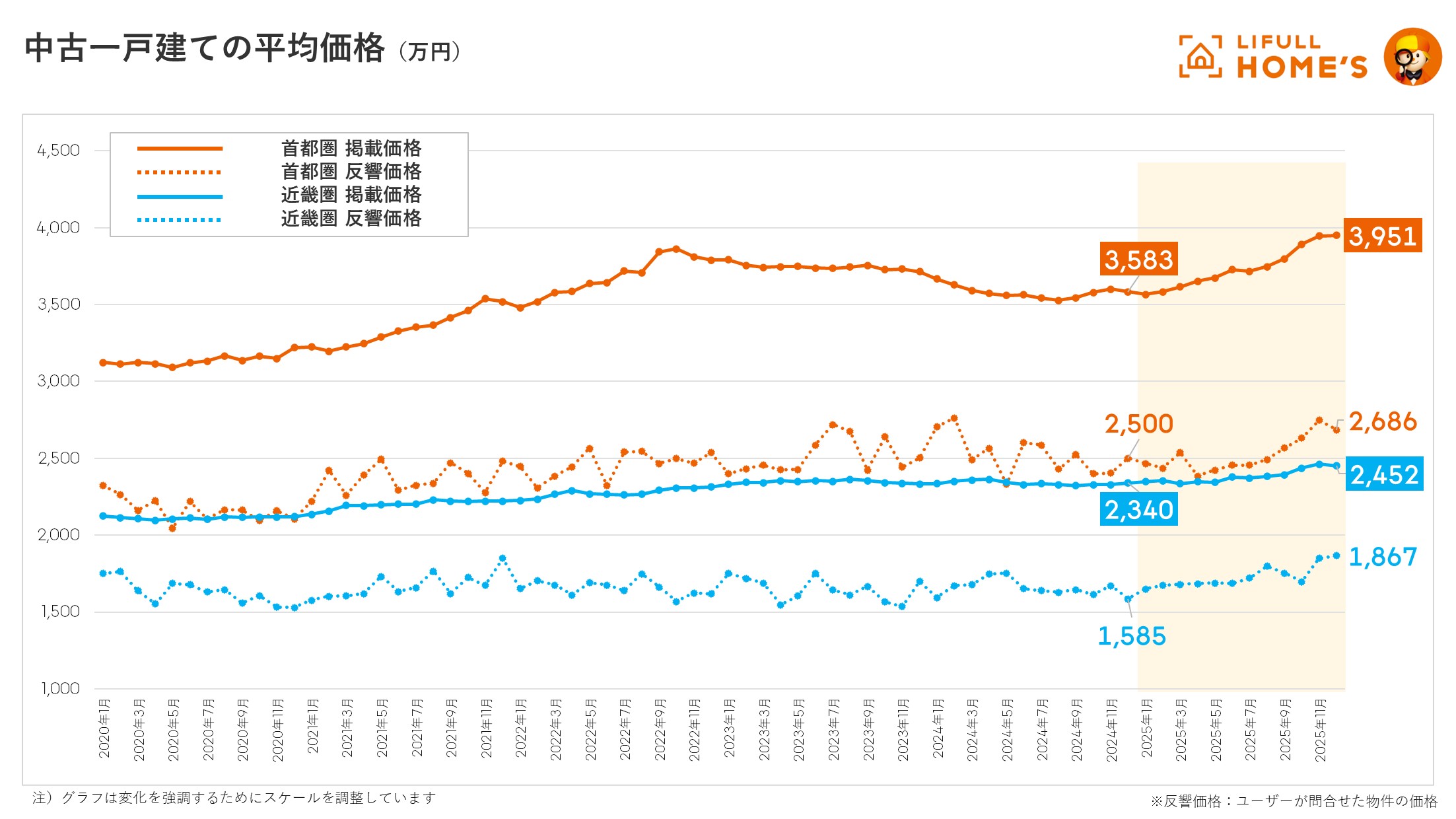 2025年12月の一戸建ての掲載価格は、首都圏で3,951万円(前年同月比+10.3%)となり、2020年の計測開始以降の最高値を更新しました。なお、近畿圏では2,452万円(同+4.8%)となり、こちらも計測開始以降2番目の高さとなりました(最高値は2025年11月の2,462万円)。