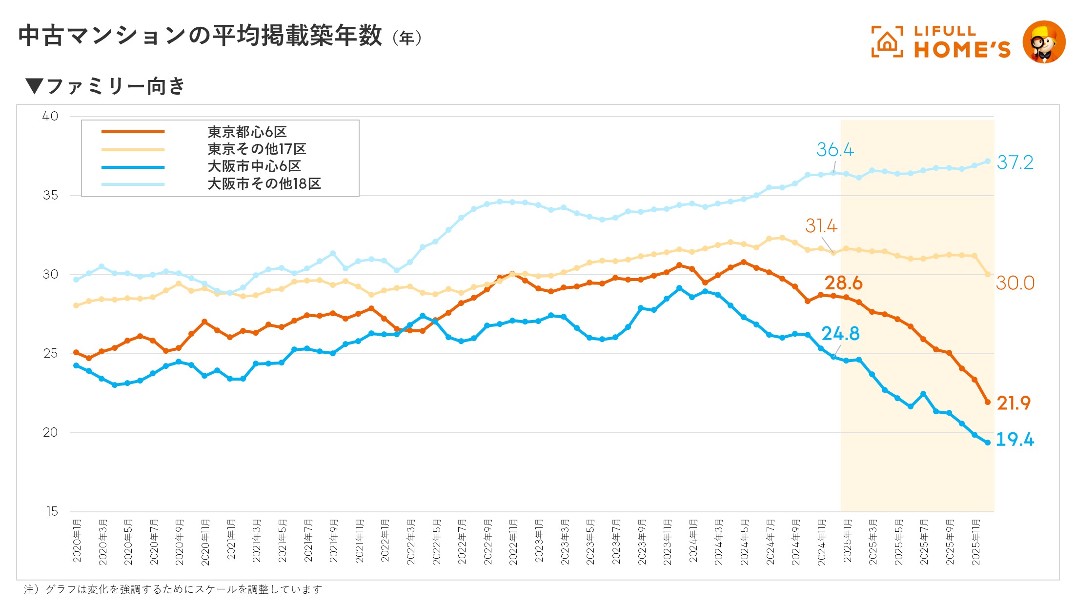・掲載築年数は1年間で東京都心部が7年、大阪市中心部が6年若返る