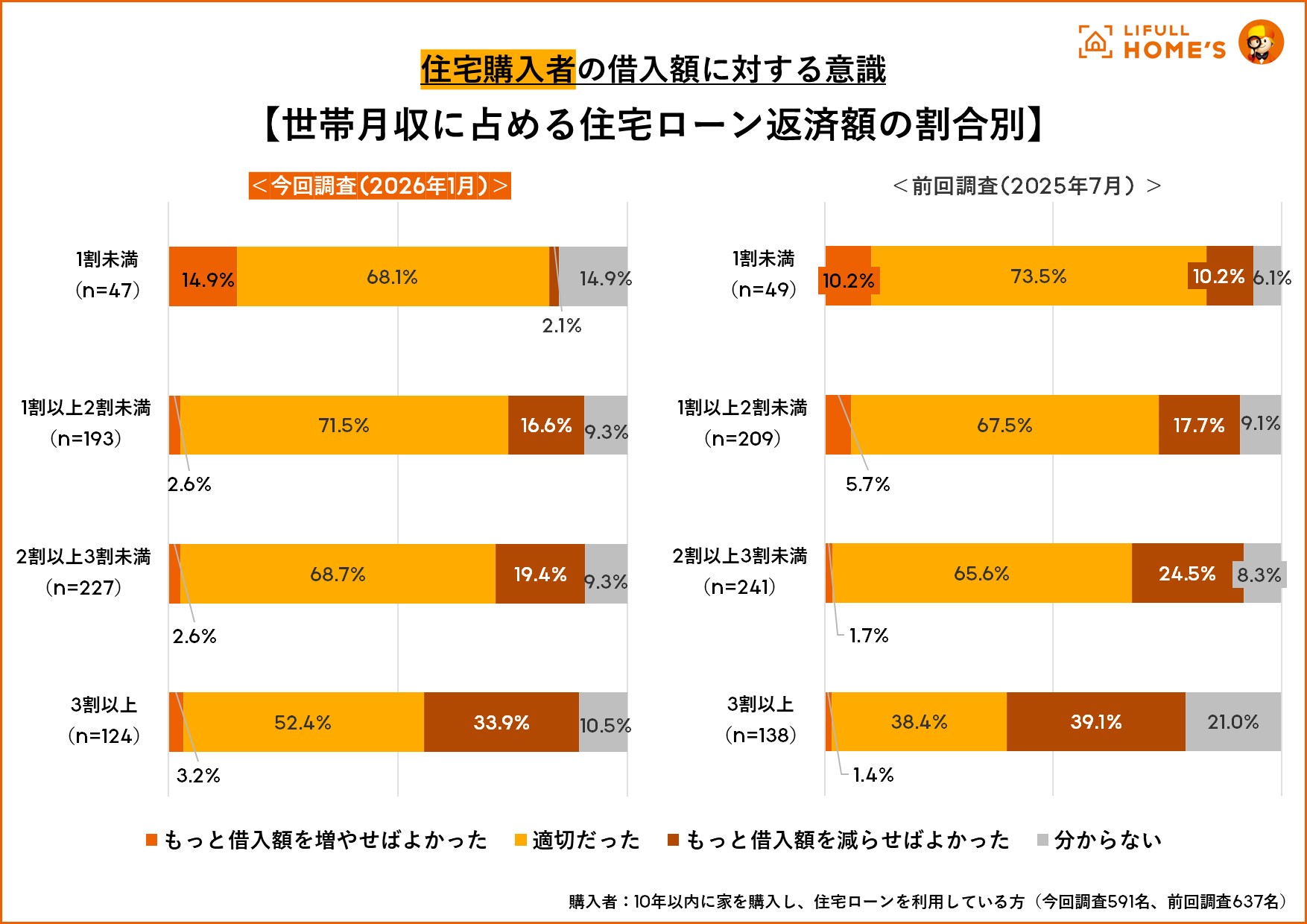 ③(購入者)世帯月収に占める住宅ローン返済額の割合:「3割以上」の割合が前回調査よりも増加。「適切だった」も増加するが、割合が3割以上の“3人に1人”は「もっと借入額を減らせばよかった」と回答
