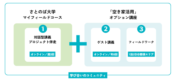 本プログラムは、さとのば大学「マイフィールドコース」のオプショナル講座として開講し、体系的な「オンライン講義・伴走サポート」に加えて、「空き家活用」に特化した特別講義およびフィールドワークを提供します。