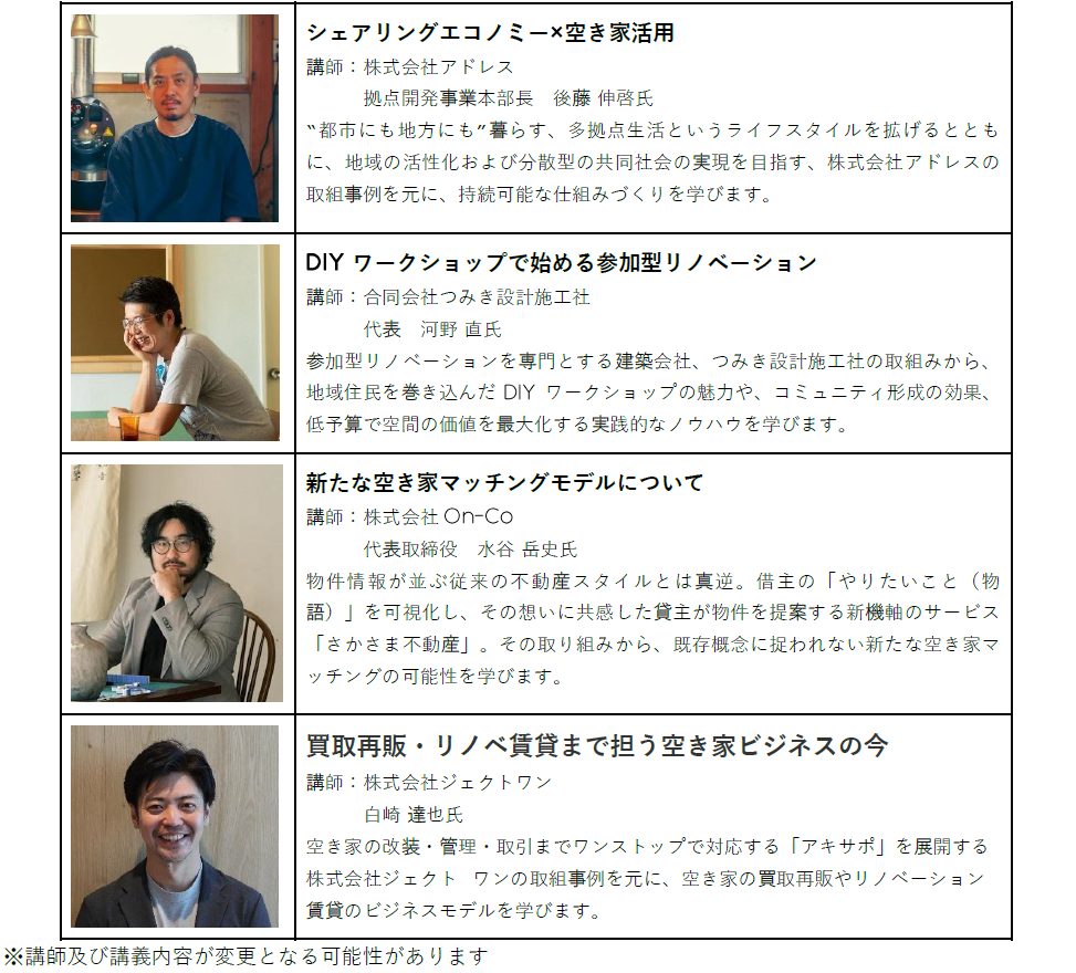 この空き家活用講座は、こうした課題を解消することを目的に誕生しました。両社の強みを融合させた包括的な支援を提供することで、空き家を地域資源へと転換する実践的な人材を育成すると共に、持続可能な地域につながる空き家活用モデルの創出を目指します。