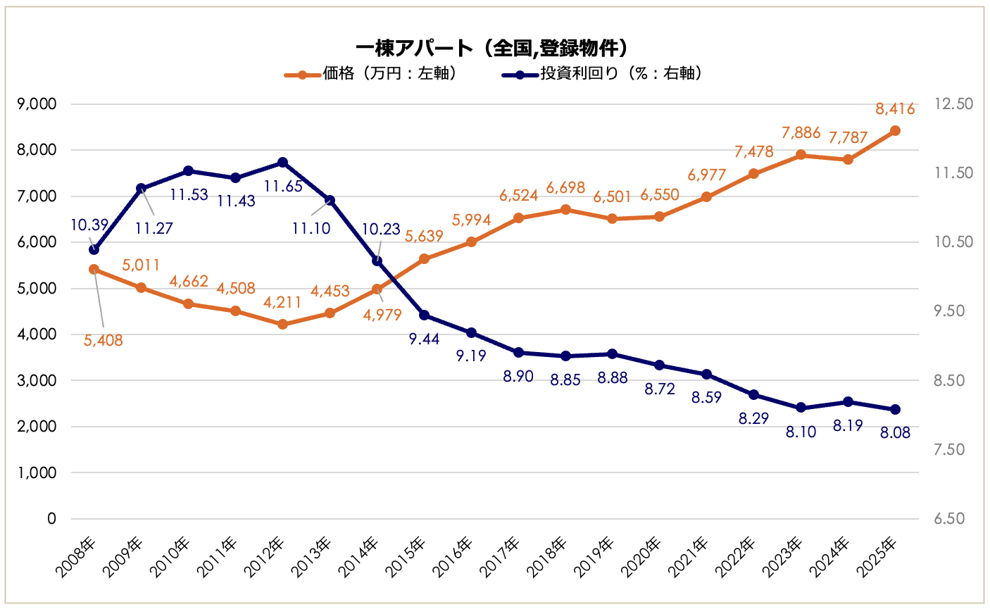 2025年の全国一棟アパート価格は8,416万円となり、前年比で8.08%上昇しました。区分マンション(+15%超)ほどの急騰ではないものの、2012年の底値(4,211万円)からは約2.0倍の水準まで堅調に拡大しています。利回りは8.08%(前年比-0.11ポイント)となり、依然として低下トレンドにありますが、区分マンションや一棟マンションと比較すると8%台という比較的高い水準を維持しています。
