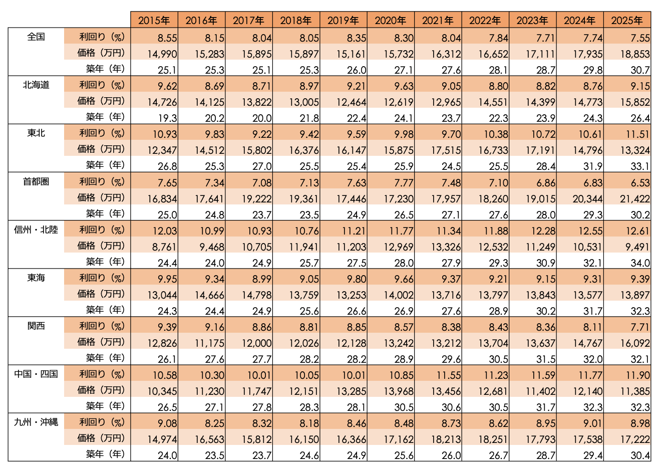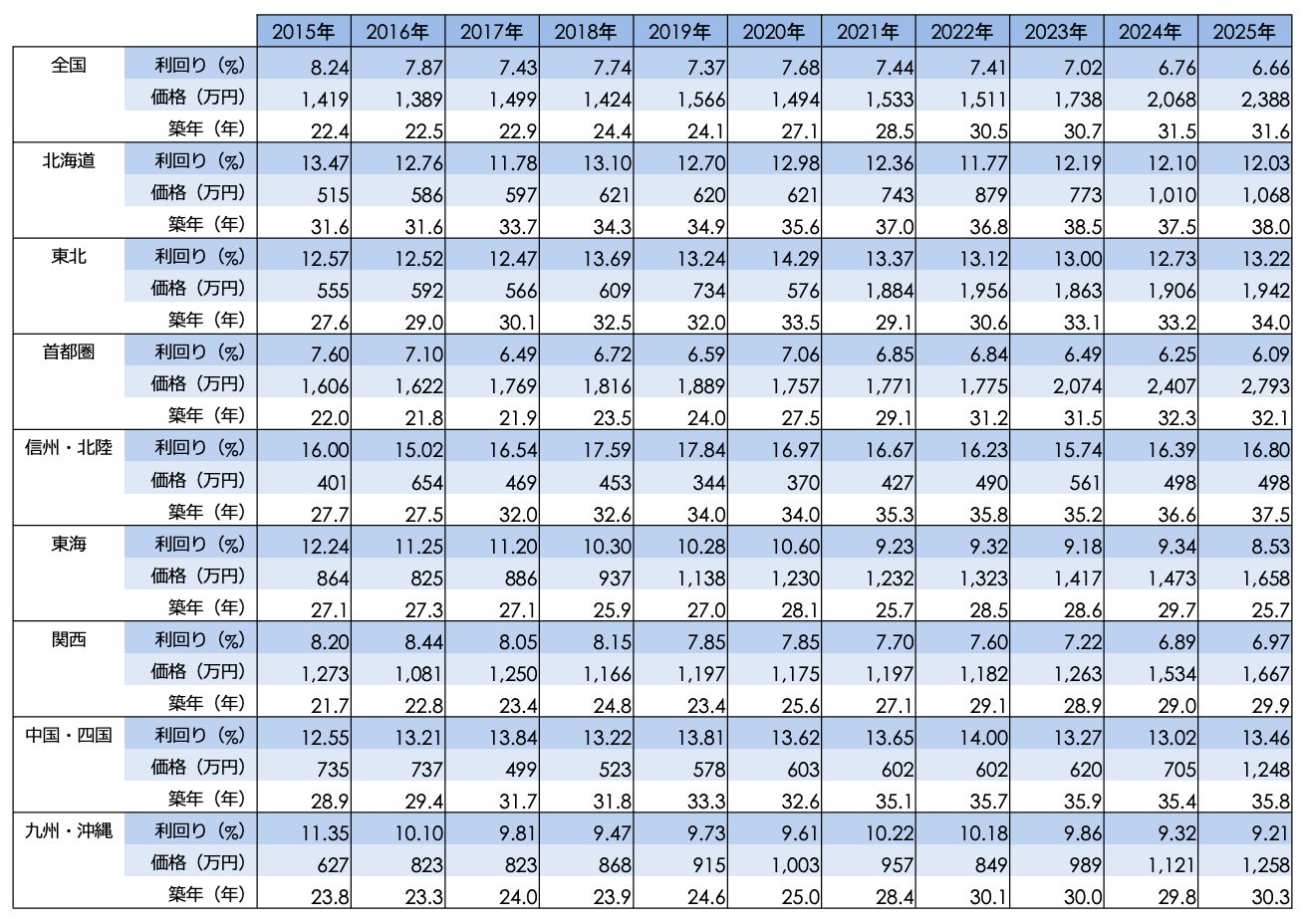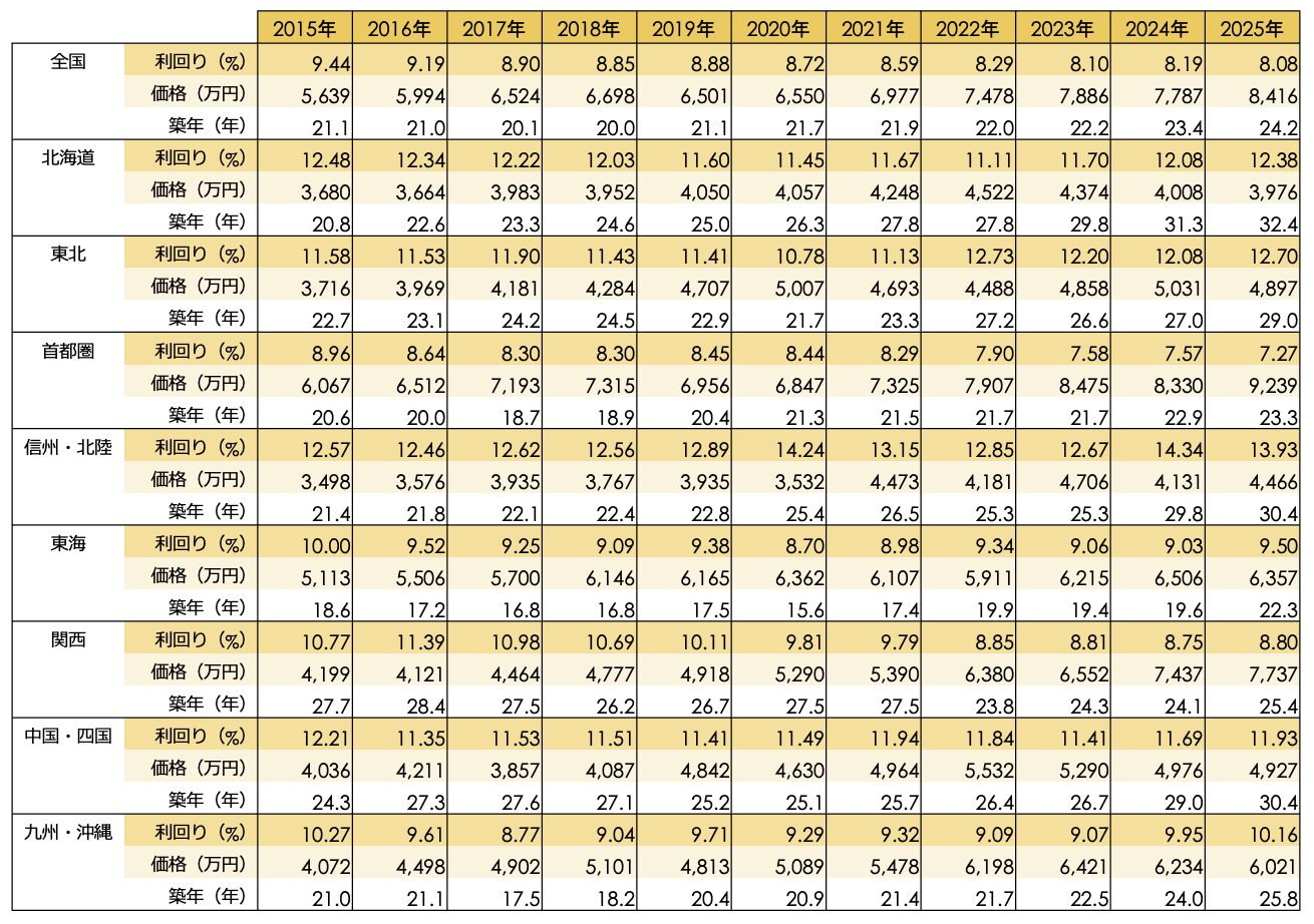 地域別の動向を見ると、首都圏の平均価格は9,239万円(前年比+10.91%)、関西圏は7,737万円(同+4.03%)と、都市圏が価格上昇を牽引しています。一方で、北海道、東北、東海などの地方圏では価格が前年から下落または横ばいとなっており、都市圏への一極集中傾向が見られます。利回りに関しては、信州・北陸(13.93%)、東北(12.70%)、北海道(12.38%)など、地方圏では10%を大きく超える高水準が継続しています。