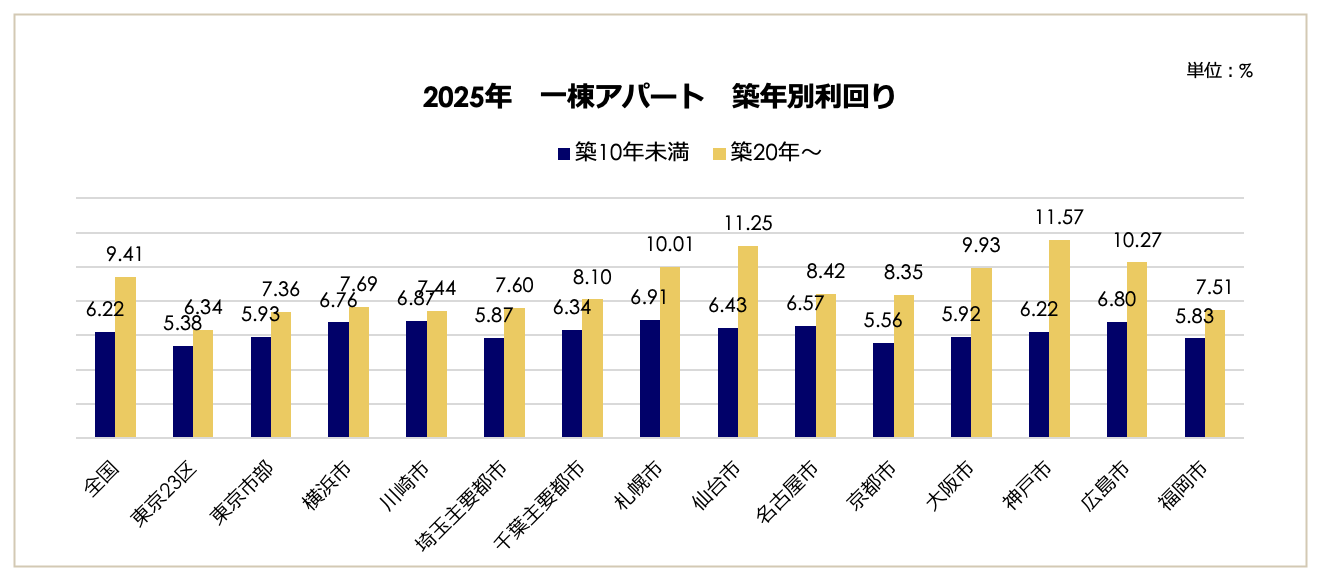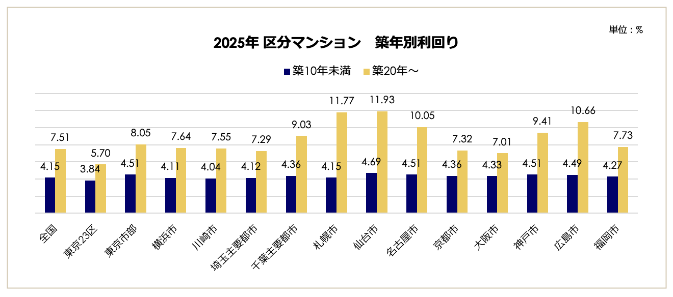 築年数による利回りの変化を見ると、エリアによる資産価値維持力の差が顕著です。東京23区では、築10年未満(5.38%)と築20年以降(6.34%)の差が0.96ポイントと1ポイント未満に留まり、築古物件でも高い価格が維持されています。対照的に神戸市ではその差が5.35ポイント(6.22% vs 11.57%)と大きく開いており、築年数の経過と共に利回りが急上昇(価格が下落)する傾向が見られます。