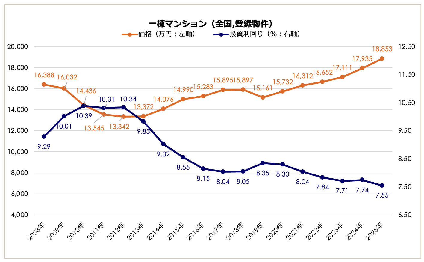 2025年の全国一棟マンション価格は1億8,853万円となり、前年比+5.12%(1億7,935万円)の上昇を記録しました。2012年の底値(1億3,342万円)と比較すると約1.4倍の水準まで上昇しており、緩やかながらも着実な価格上昇トレンドが継続しています。利回りは7.55%(前年比-0.19ポイント)へ低下し、2008年以降の集計で過去最低水準を更新しました。