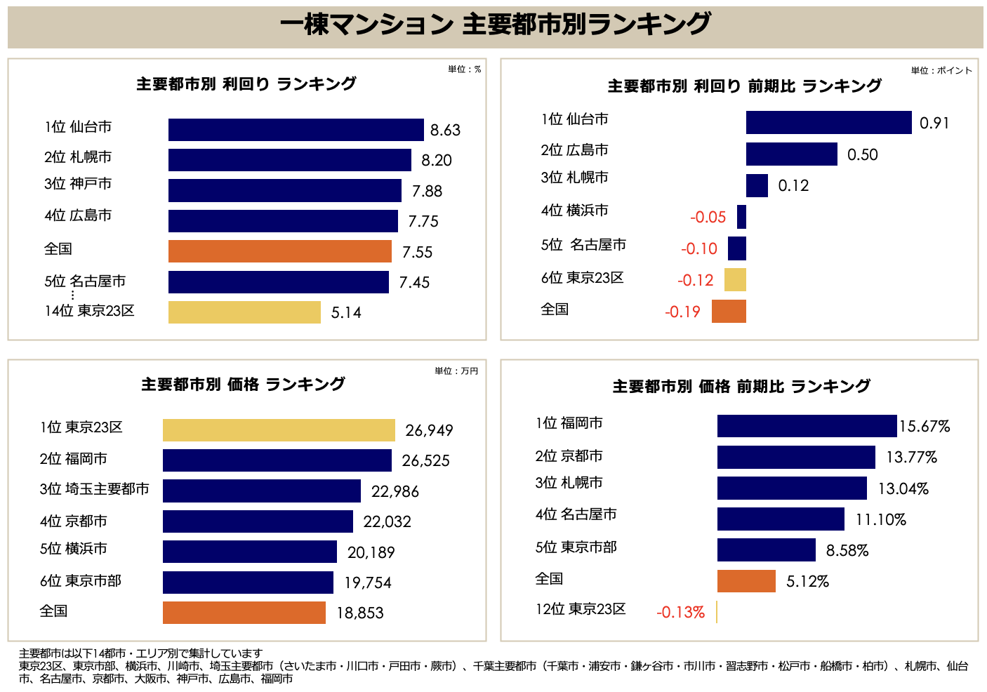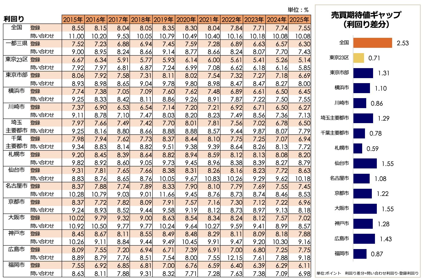 利回りについては、仙台市(8.63%)、札幌市(8.20%)、神戸市(7.88%)などが8%前後〜後半の水準を示しており、価格上昇が続く中でも地方都市では比較的高い収益性が確保されています。