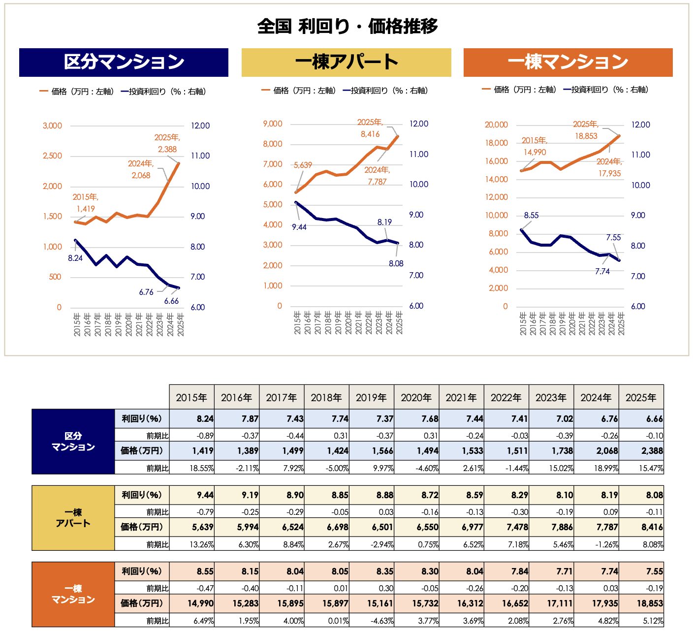 全国平均価格は前年比8%上昇。利回りは低下傾向続くも、3種別で唯一8%台を維持。