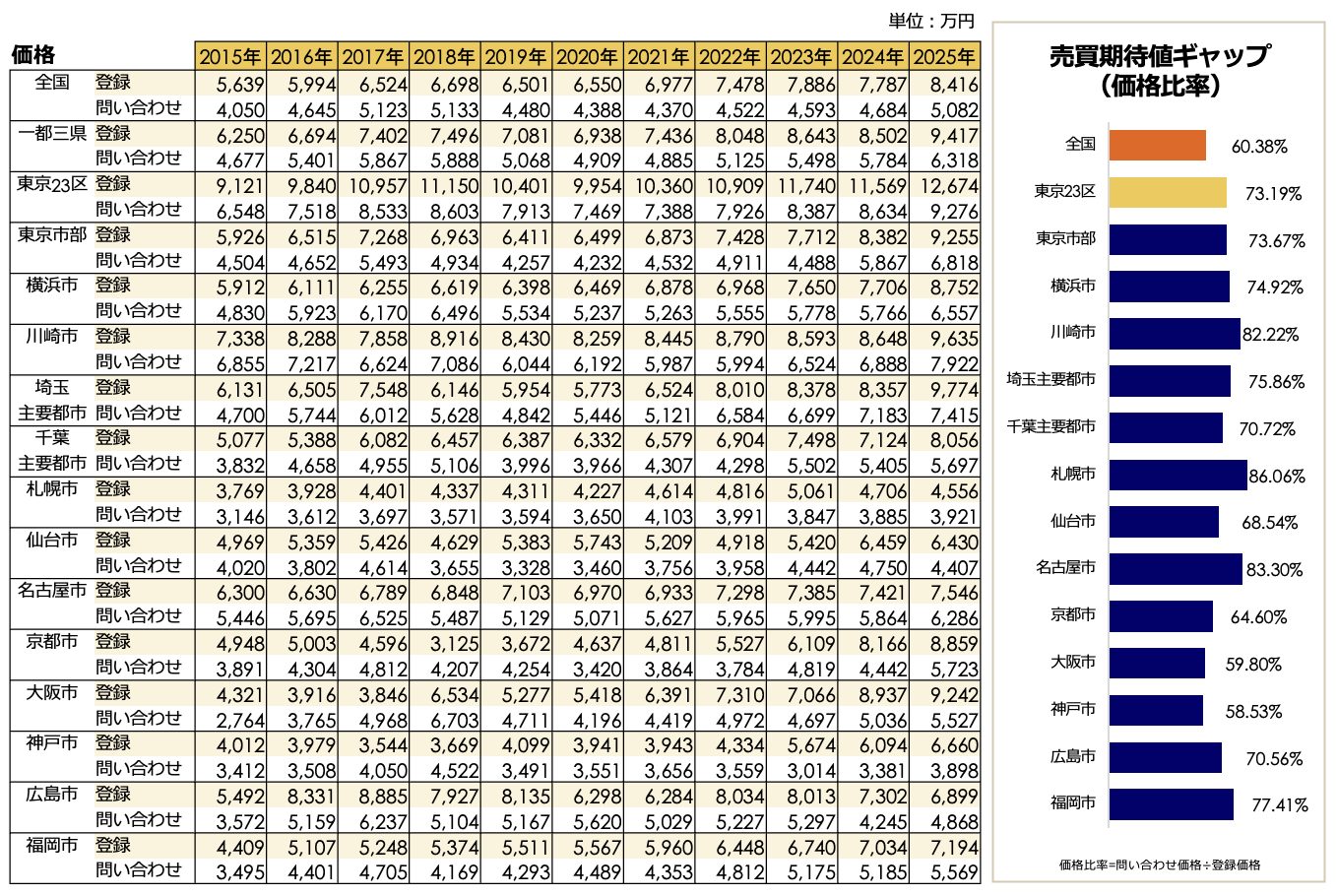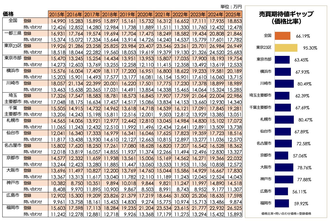 全国平均価格は前年比5%上昇し、過去最高値を更新。福岡市が東京23区に匹敵する高水準へ急伸を見せる。