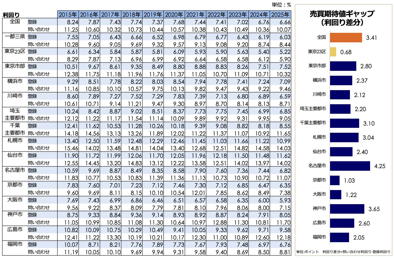 こうした市場環境下における売買期待値ギャップを見ると、地域ごとに大きな違いが見られます。札幌市は利回り差が0.88ポイントと1ポイント未満で、価格比率は86.06%と全国主要都市の中で最も高く、売り出し価格の8割強〜9割近い水準で買い手が追随しており、成約しやすい環境にありそうです。一方で、大阪市は利回り差が2.99ポイントと大きく、価格かい離率は59.80%と約6割の水準に留まっており、登録価格(売り手)と問い合わせ価格(買い手)の間に大きな溝があります。