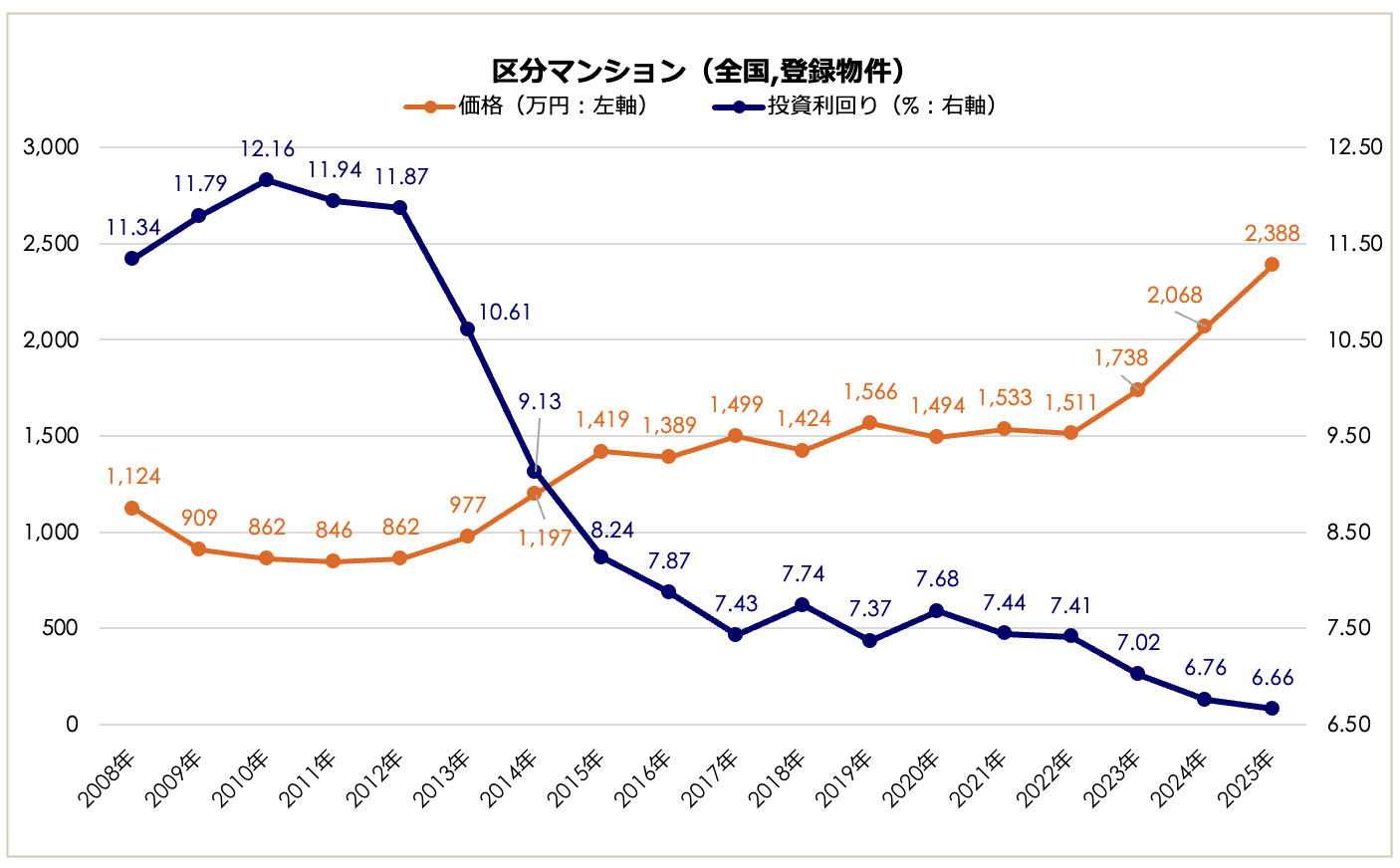 2025年の全国区分マンション価格は2,388万円となり、2023年以降の上昇トレンドがさらに加速し、前年比で15.47%の大幅上昇、2011年の底値(846万円)と比較すると約2.8倍の水準まで高騰しています。2008年以降の集計以来過去最高値を更新する結果となりました。価格上昇に伴い投資利回りは低下を続け、前年比0.10ポイント低下の6.66%と、同集計で過去最低値を記録しています。