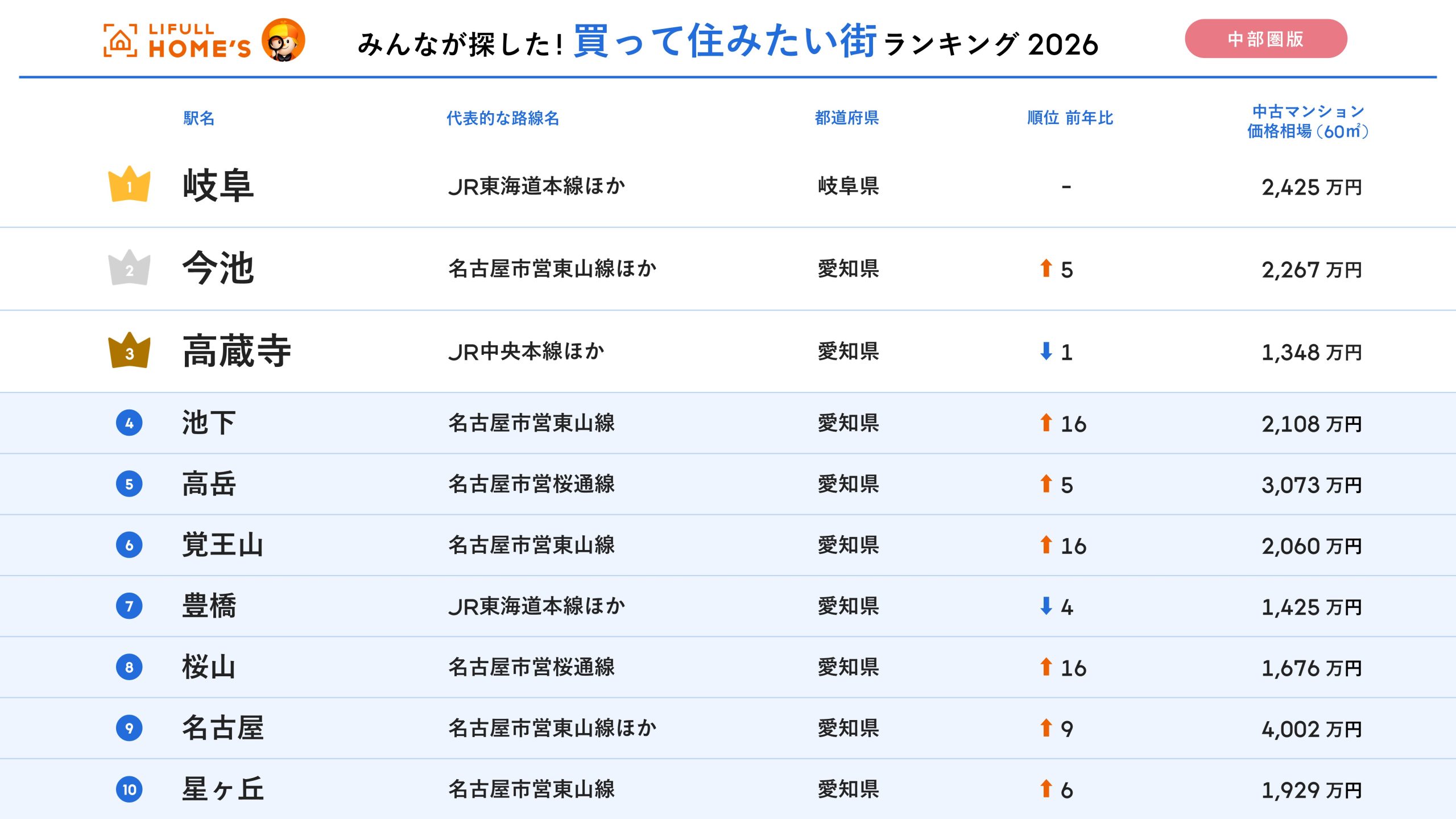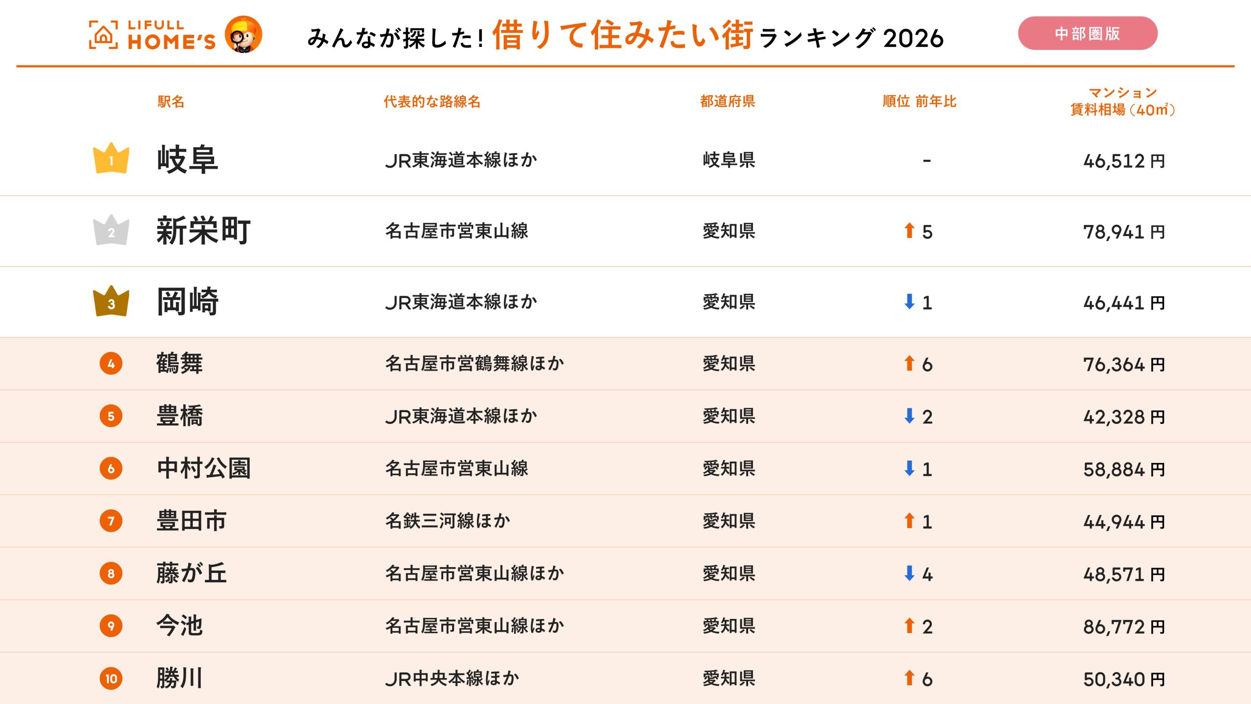 <中部圏版> 2026年 LIFULL HOME'S みんなが探した!住みたい街ランキング