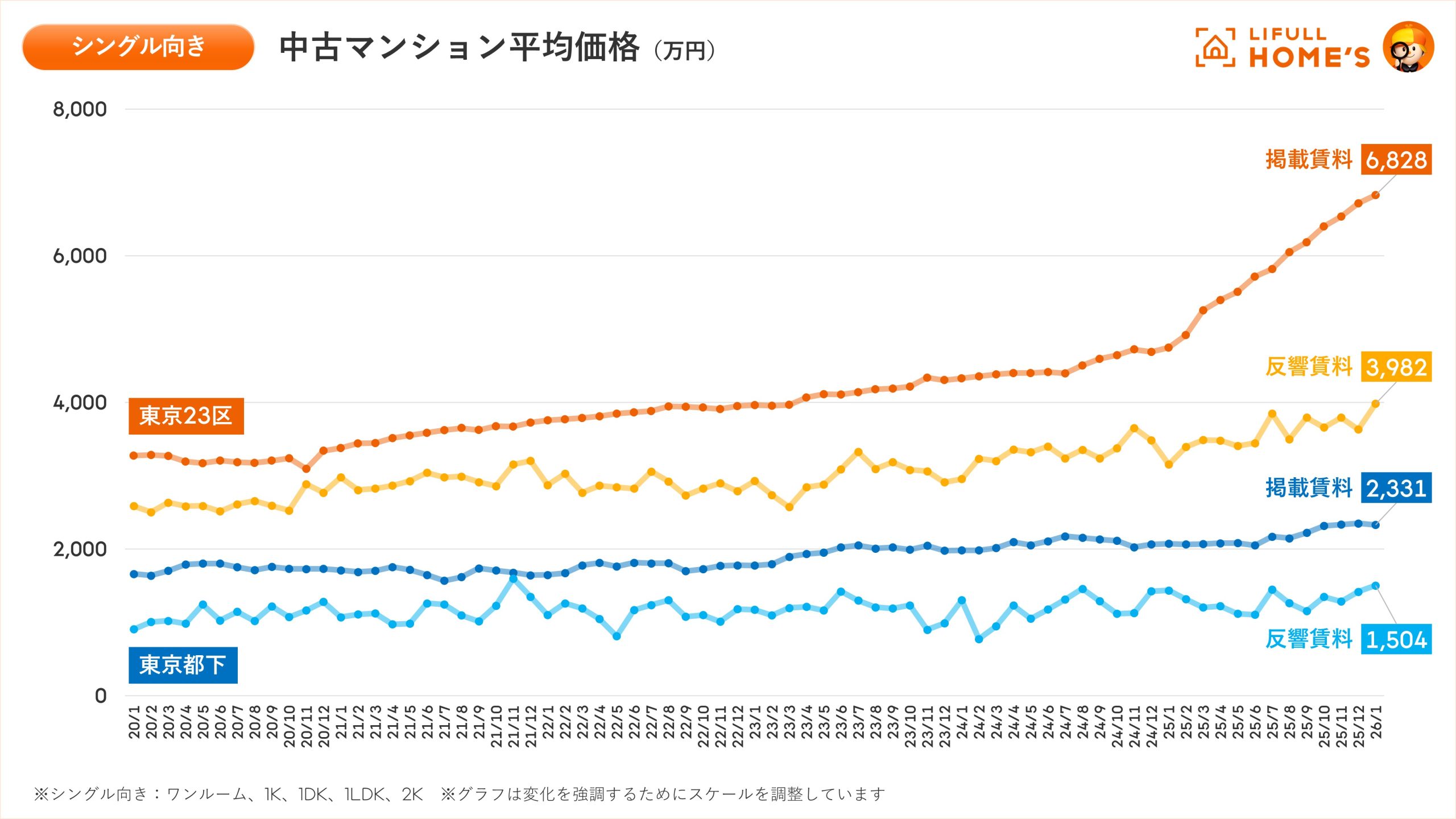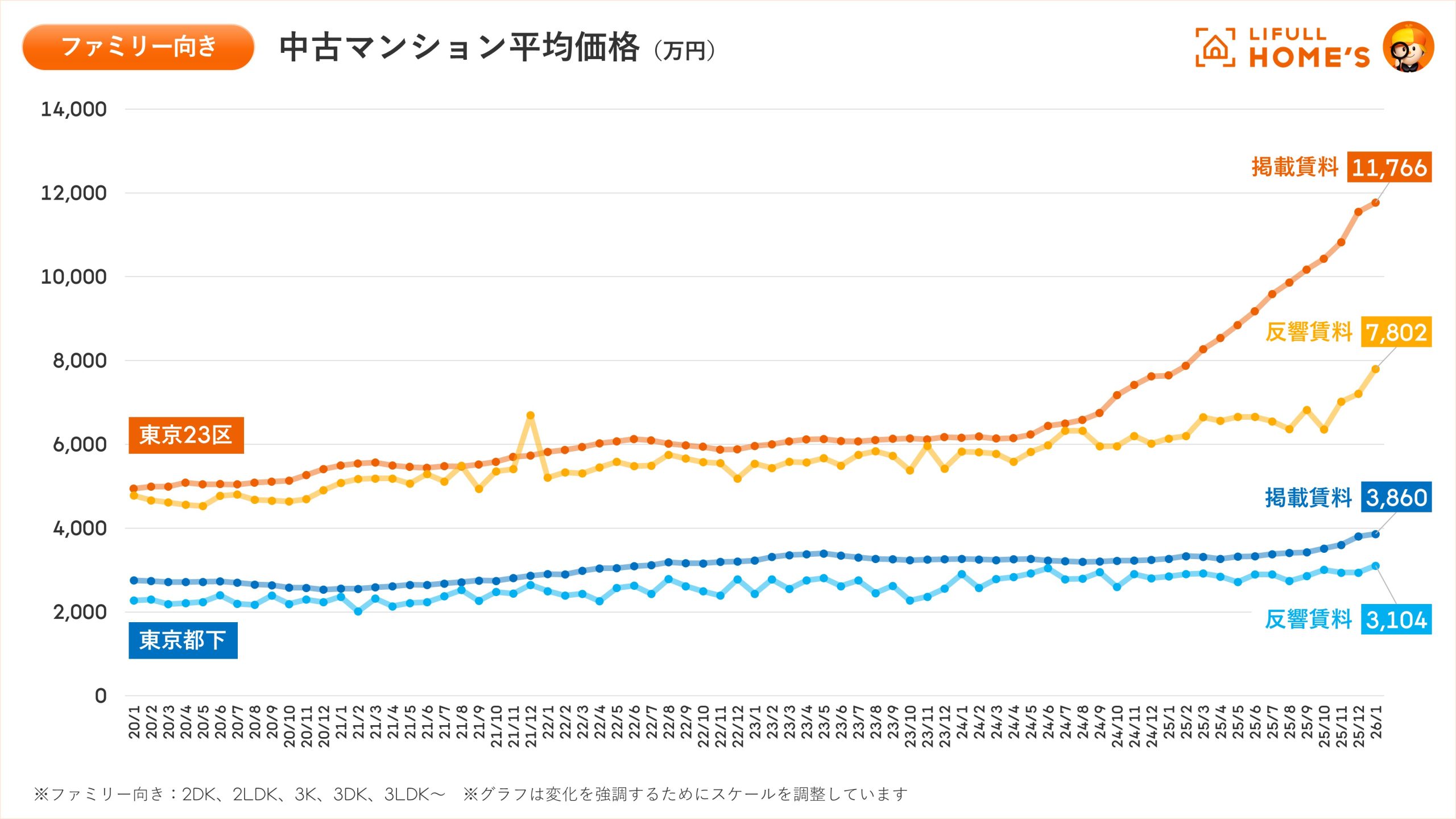 【価格動向】東京23区の中古マンション価格はファミリー・シングルともに「過去最高」を更新、ファミリー向き中古マンション価格は22か月連続で上昇(LIFULL HOME'Sマーケットレポート2026年1月)