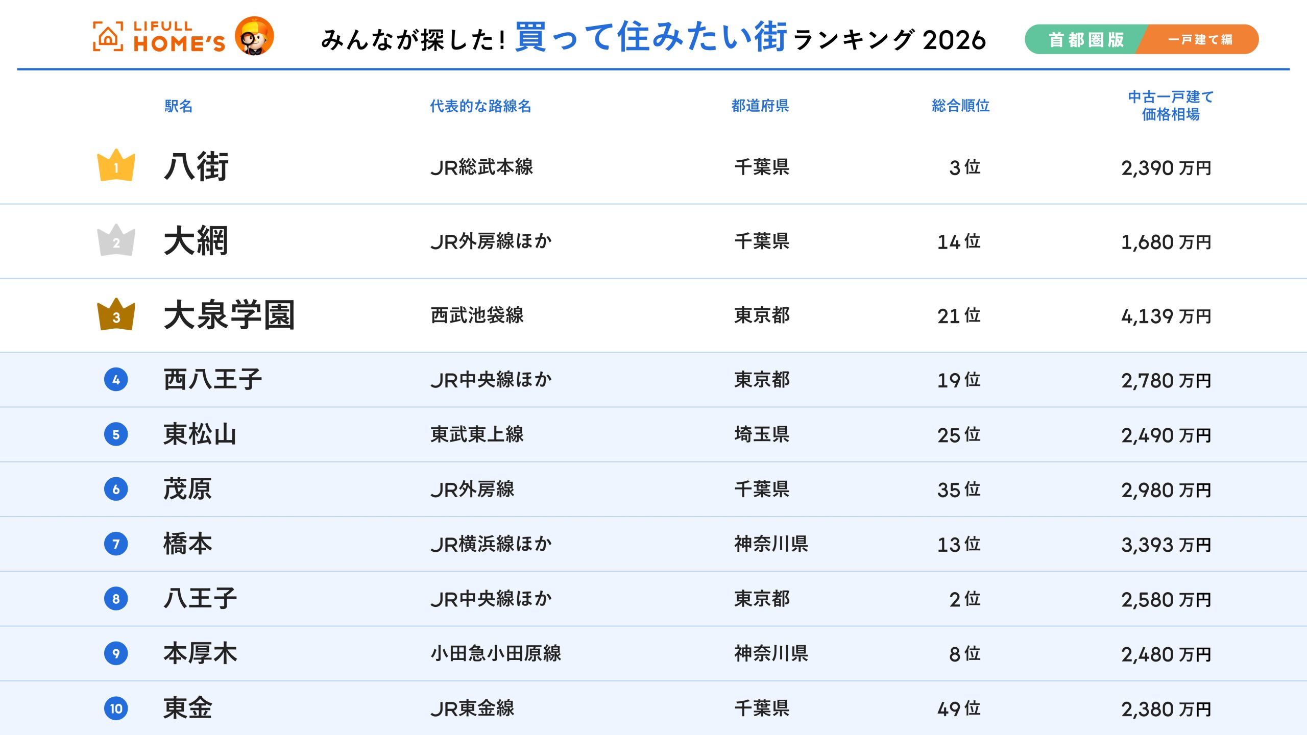今回初めて発表する、首都圏の「買って住みたい街」について、一戸建てのみを集計した「2026年 LIFULL HOME'S みんなが探した!買って住みたい街ランキング(首都圏版・一戸建て購入編)」は、総合ランキング3位の「八街」が1位に輝きました。