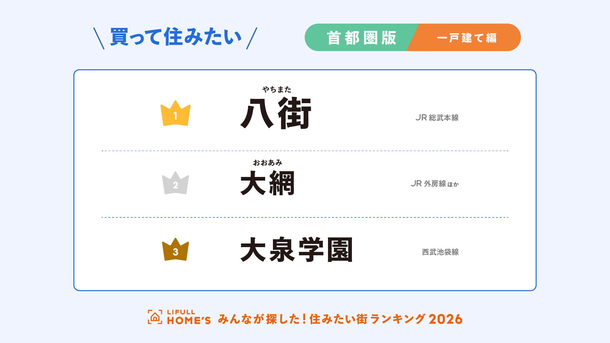 事業を通して社会課題解決に取り組む、株式会社LIFULL(本社:東京都千代田区、代表取締役社長:伊東祐司、東証プライム:2120)が運営する不動産・住宅情報サービス「LIFULL HOME'S(ライフルホームズ)」は、首都圏の「買って住みたい街」について、一戸建てのみを集計した「2026年 LIFULL HOME'S みんなが探した!買って住みたい街ランキング(首都圏版・一戸建て購入編)」を初めて発表します。