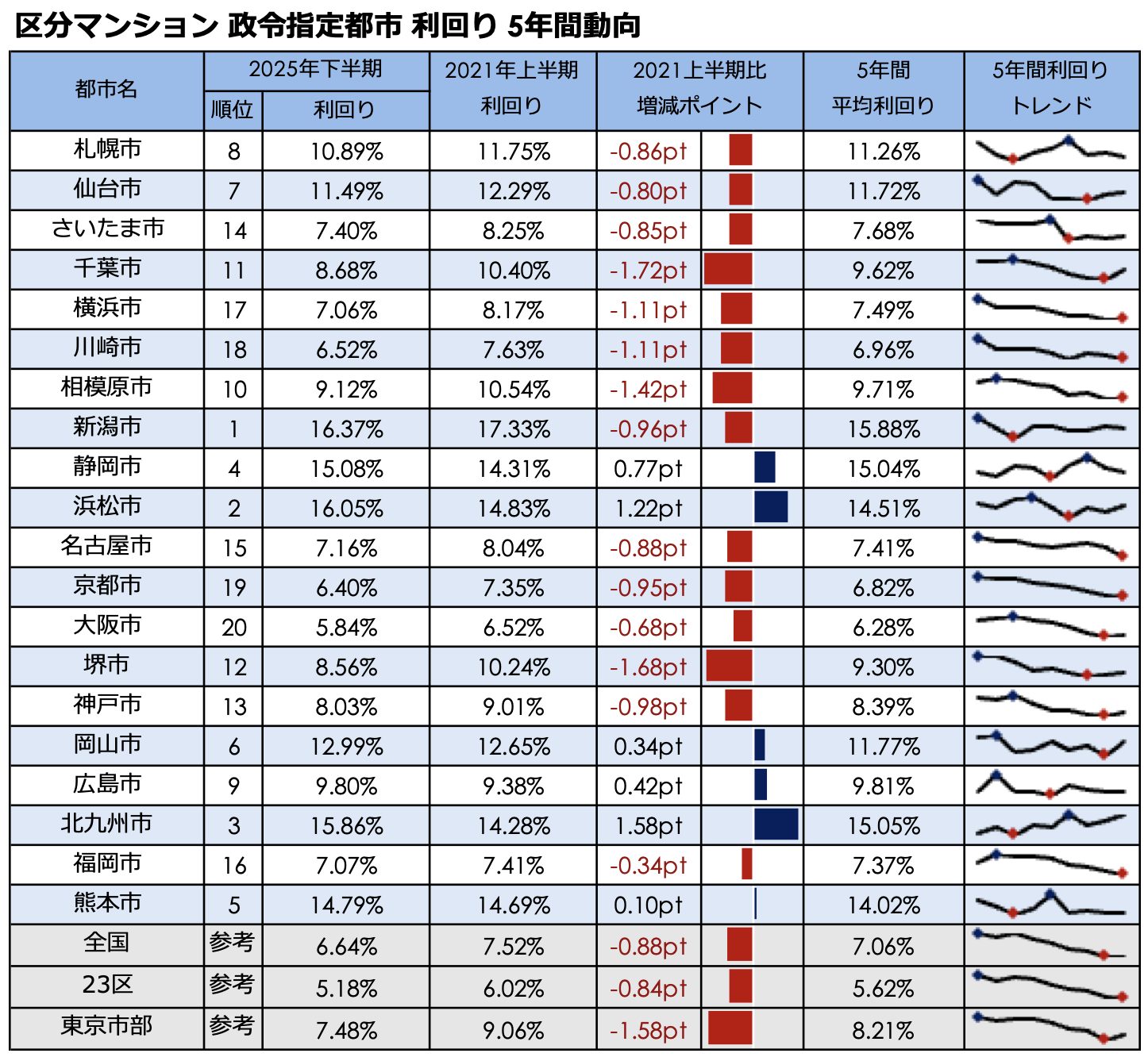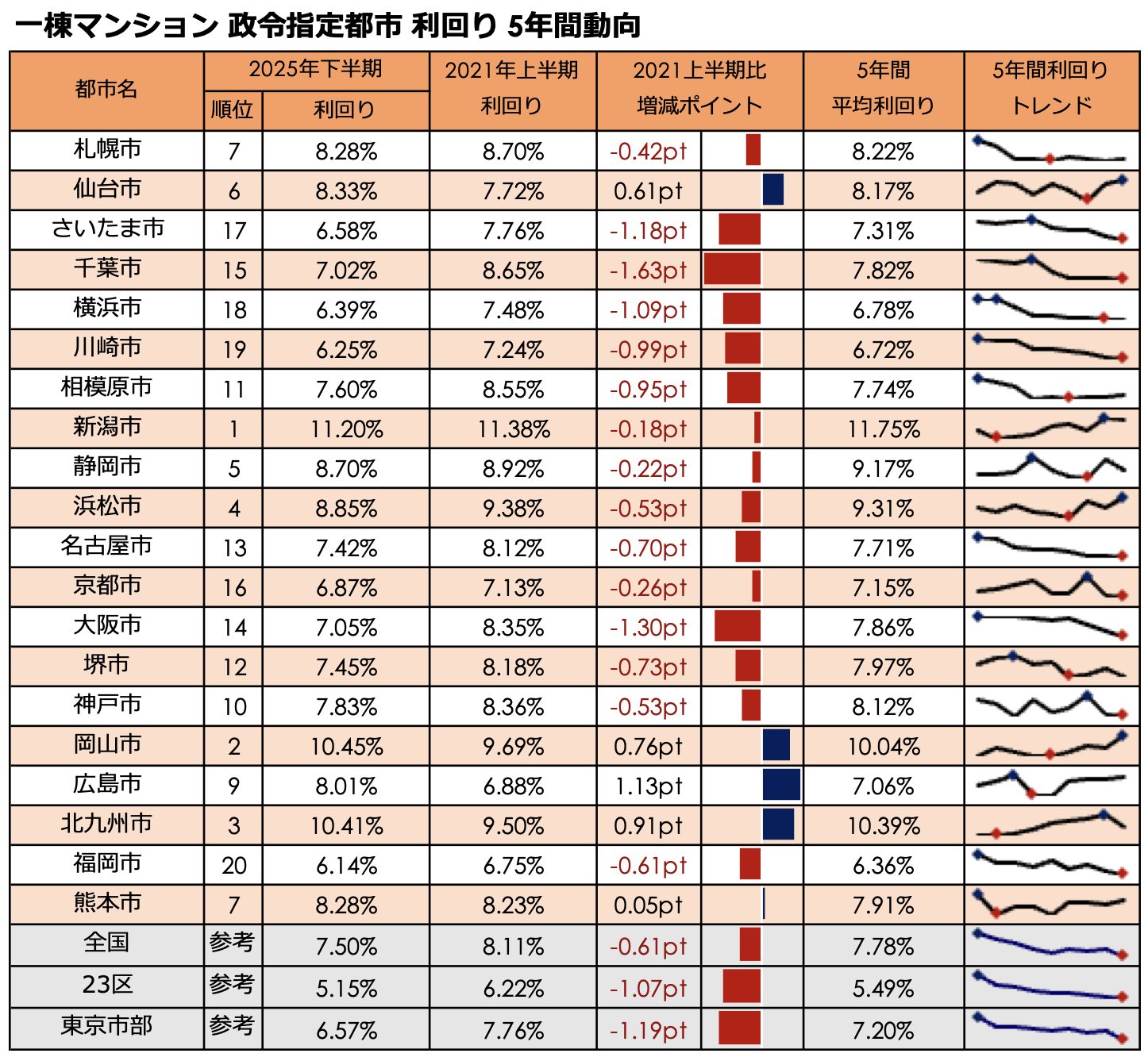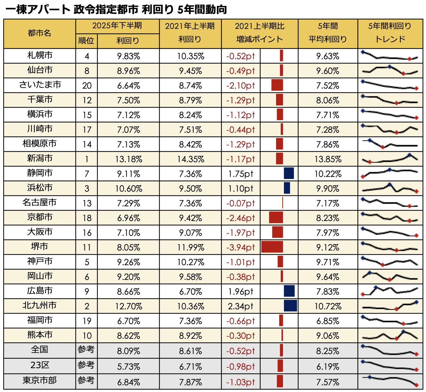 新潟市が全種別で利回り1位を堅持。5年間動向では北九州(区分・一棟アパ)や広島(一棟マン)の上昇が最大。健美家 「2025年下半期 政令指定都市 住宅系収益不動産 高利回りランキング」