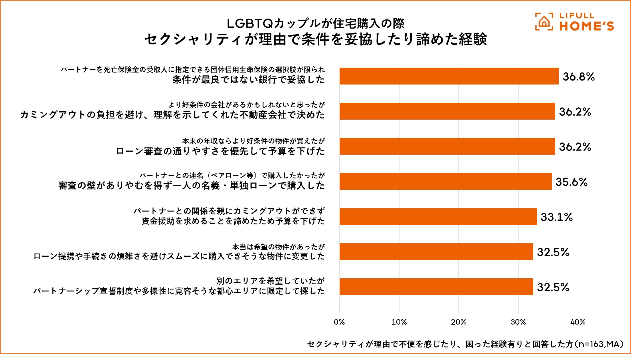 LGBTQカップルで住宅購入時に困った経験がある方に住宅購入の際に、セクシャリティが理由で条件を妥協、諦めた経験について聞いたところ、最も多い回答は「パートナーを死亡保険金の受取人に指定できる団体信用生命保険の選択肢が限られ、条件が最良ではない銀行で妥協した(36.8%)」でした。