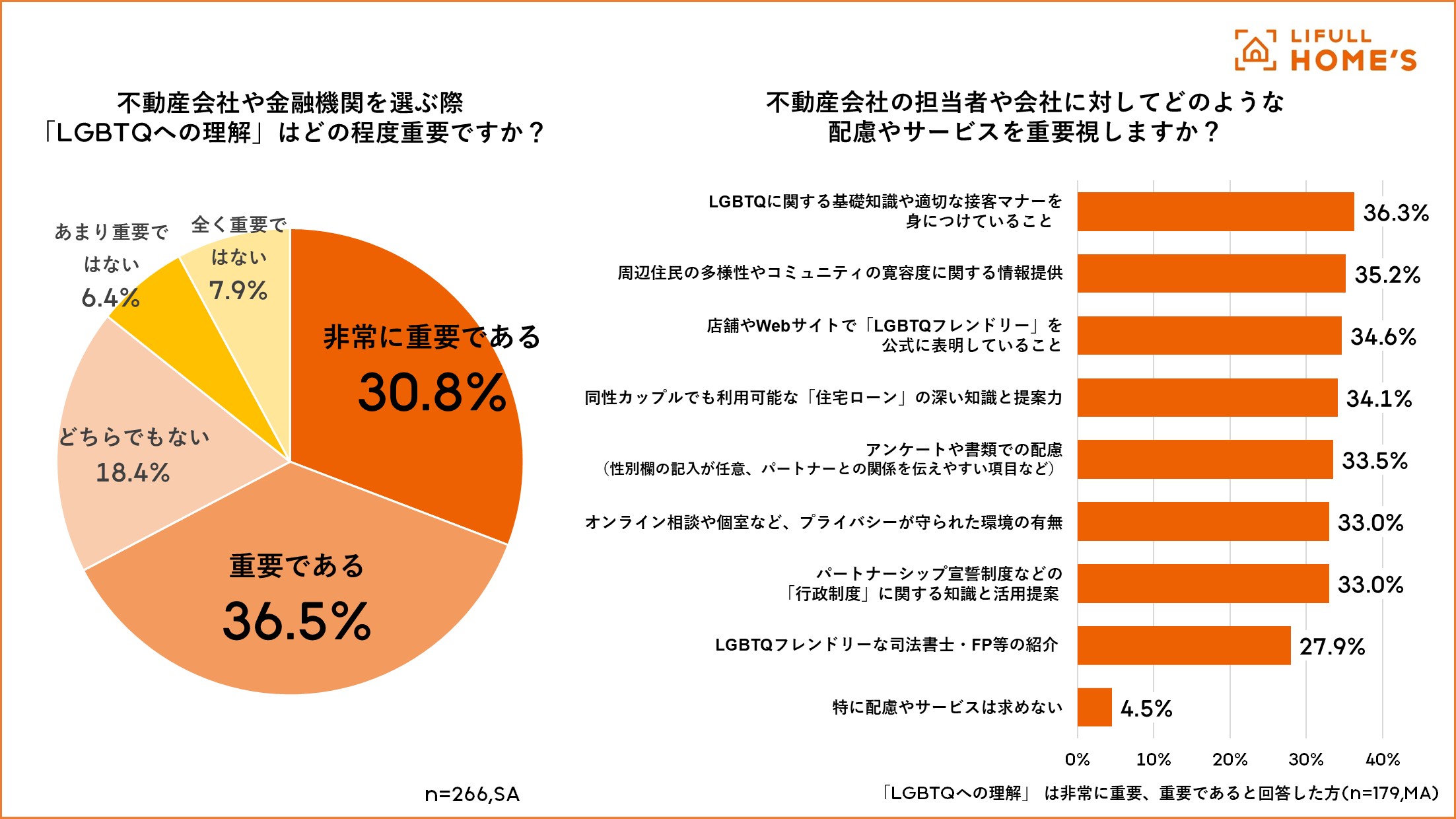 不動産会社や金融機関を選ぶ際に「LGBTQへの理解」については67.3%が「重要である」(合計:「非常に重要である」30.8%,「重要である」36.5%)と回答しました。「重要である」と回答した方に、不動産会社や担当者に求めることは、「基礎知識や適切な接客マナー(36.3%)」や「周辺住民の多様性や、コミュニティの寛容度の情報提供(35.2%)」、「店頭やサイトでのLGBTQフレンドリーの表明(34.6%)」など、特別なサービス以上に、安心して相談できる環境整備が上位に挙がっています。住宅ローンや行政制度の知識や提案、LGBTQフレンドリーな行政書士・ファイナンシャルプランナーの紹介など具体的な事務手続きに関する回答も挙がりました。