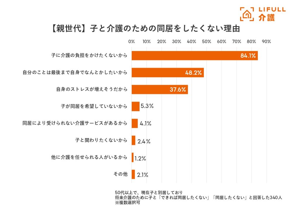 - 介護のための同居したくない理由:1位は親世代「子に介護による負担をかけたくない」子世代「介護によるストレスが増えそう」