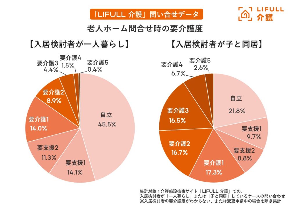 - 一人暮らしの方に比べ、子と同居している方の方が、老人ホーム問い合わせ時の要介護度が高く、緊急度の高い状況の入居希望が多い傾向に。切迫した施設探しにならないよう、子と同居でも施設入居も選択肢に