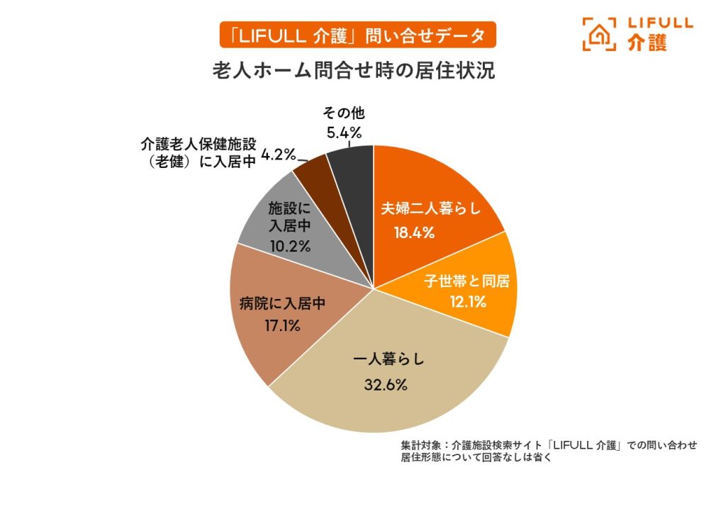 意識調査では親子ともに同居によって介護施設という選択肢を回避しようとする動きがみられましたが、実際の「LIFULL 介護」の直近1年間の老人ホーム問い合わせデータから問い合わせ時の入居検討者の居住状況をみてみると、「子世帯と同居」は12.1%と1割以上となっています。また、「夫婦二人暮らし」18.4%と合せると、同居者がいる方からの老人ホーム問い合わせは3割以上となりました。