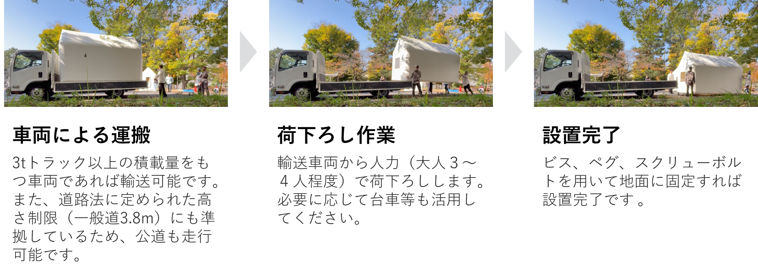 輸送⾞両から重機を使わずに⼈⼒(⼤⼈3〜4⼈程度)で荷下ろしができ、ビス、ペグ、スクリューボルトを⽤いて地⾯に固定すれば設置完了するため、届いたその日からすぐに利用を開始できます。設置するだけで快適なプライベート空間を実現する手軽さにより、グランピング施設などの宿泊事業だけでなく、ワークスペースなどのレンタルスペース、集中できる個人の趣味空間、さらには災害時の緊急避難先まで、幅広い用途に対応します。