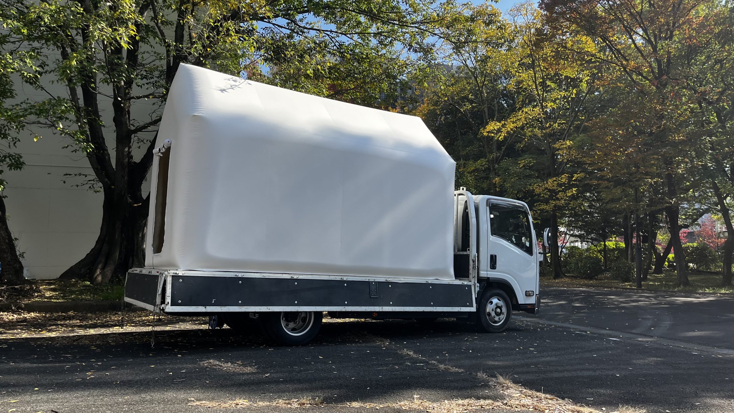 インスタントハウスは、テントシートを空気で膨らませながら、内側から断熱材を吹き付けて形成する構造物で、断熱性・遮音性に優れ、簡便かつ短時間で設置できる点が特徴です。