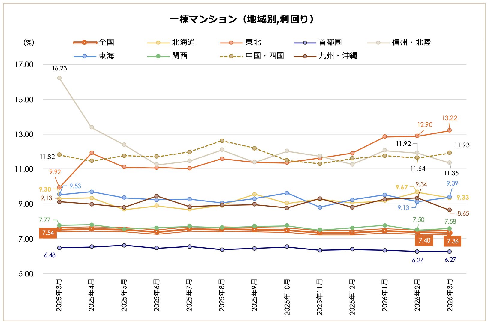 2026年3月期の一棟マンション市場は、全国平均価格が20,858万円で、2008年4月の集計開始以降の最高値を更新。前月比+2.63%、前年同月比では+12.28%となりました。全国平均利回りは7.36%で、前月比-0.04ポイント、前年同月比-0.18ポイントとなっています。