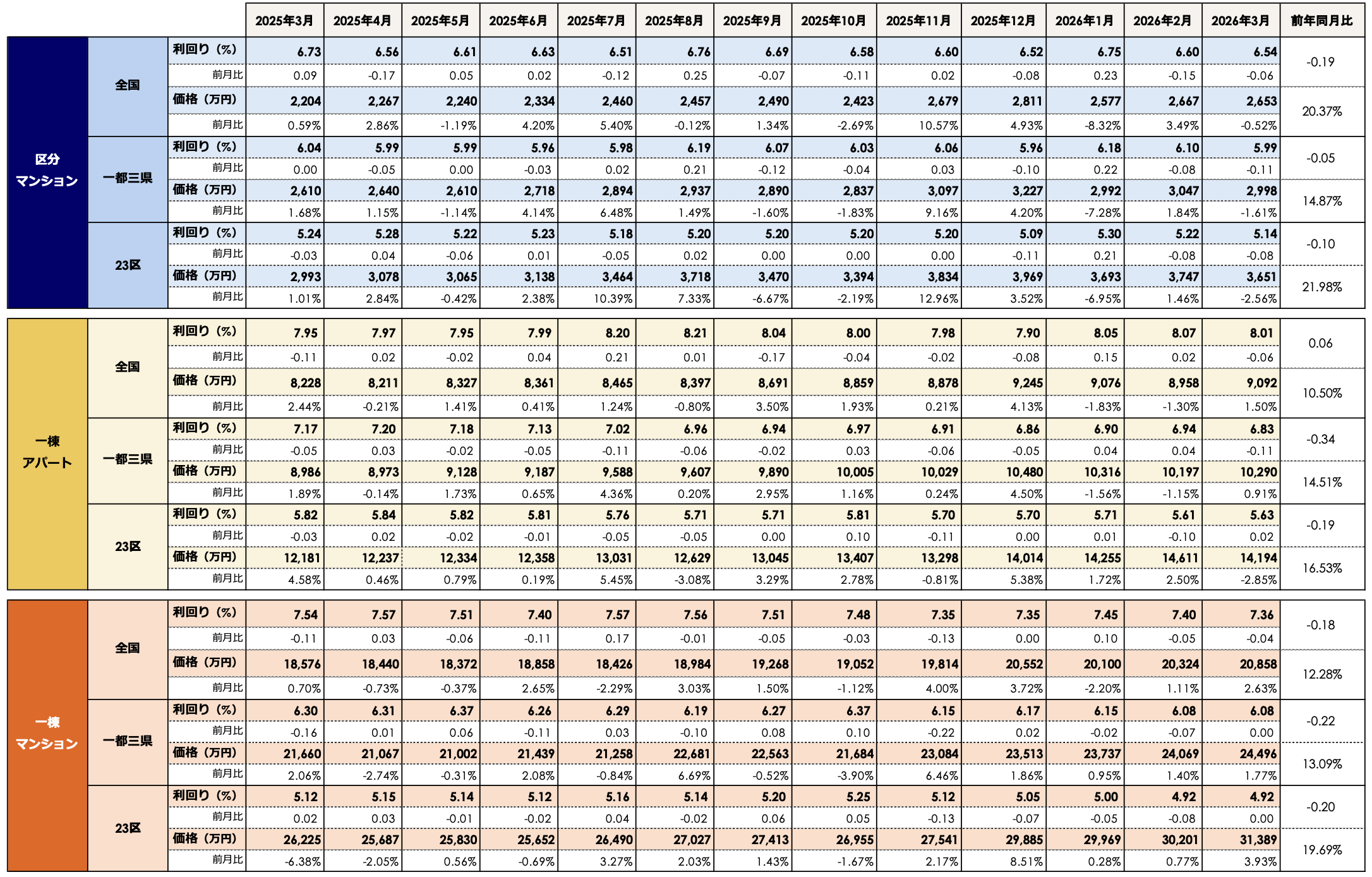 2026年3月期は、3種別とも前年同月比でみると全国平均価格の上昇傾向が続いており、一棟マンションでは2008年4月の集計開始以降の最高値を更新。一棟アパートでも、集計開始以降2番目に高い数字となりました。一方で、平均利回りは前月比、前年同月比ともにほぼ横ばいの状況が続いています。