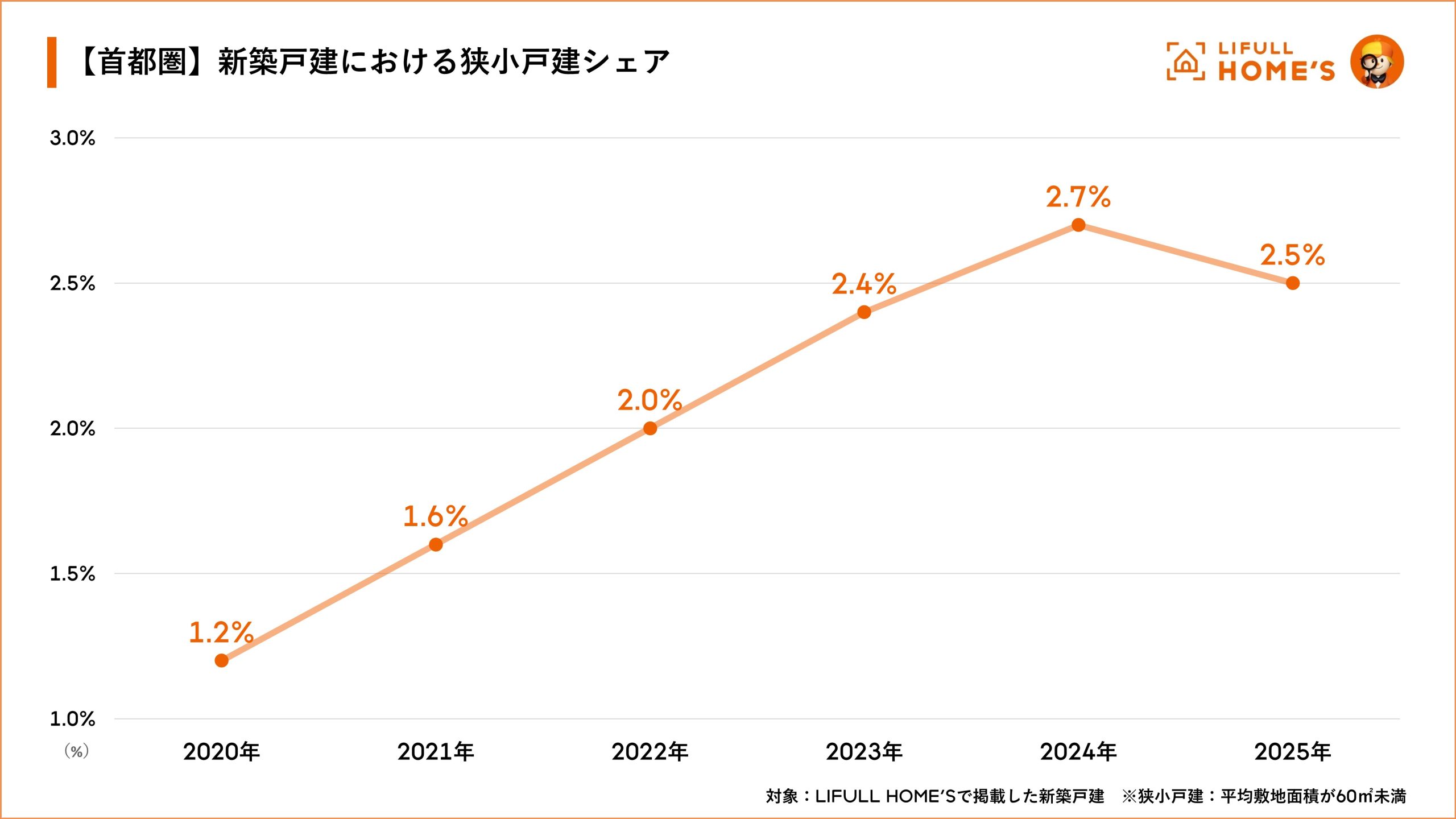 事業を通して社会課題解決に取り組む、株式会社LIFULL(本社:東京都千代田区、代表取締役社長:伊東祐司、東証プライム:2120)が運営する不動産・住宅情報サービス「LIFULL HOME'S(ライフルホームズ)」は、首都圏で掲載された新築一戸建てにおける、専有敷地面積が60㎡未満のいわゆる「狭小戸建」について調査しました。