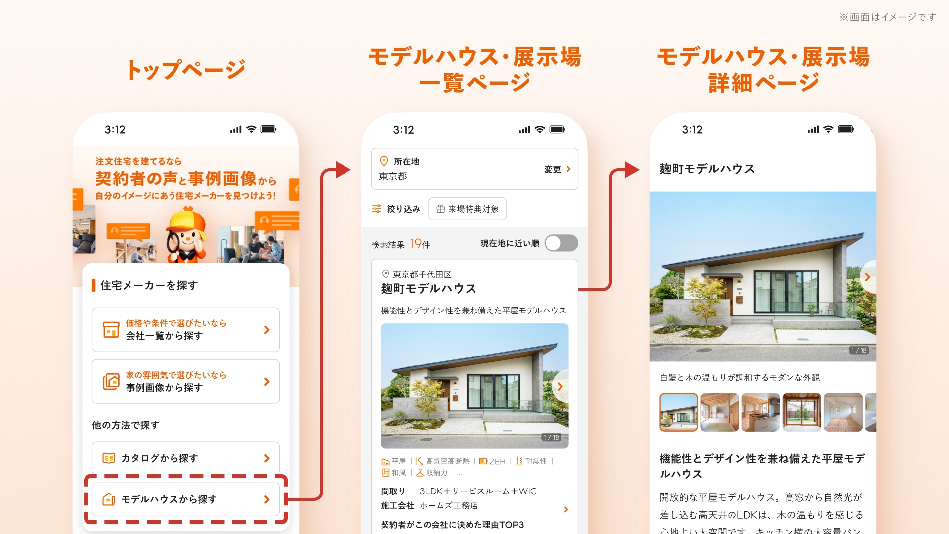 検討の入り口となるトップページに「モデルハウスから探す」ボタンを新設。これにより、ユーザーはエリアや詳細条件に合わせた「モデルハウス・展示場一覧」へ即座にアクセスすることが可能になりました。一覧ページで気になるモデルハウス・展示場 をスムーズに比較検討し、さらに詳細ページでは、豊富な画像や詳細な情報を通じて、自宅にいながら暮らしのイメージを具体的に膨らませ、納得感を持って見学予約へと進める体験を実現しています。