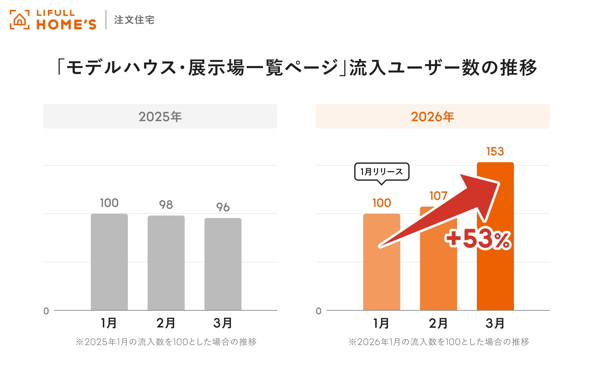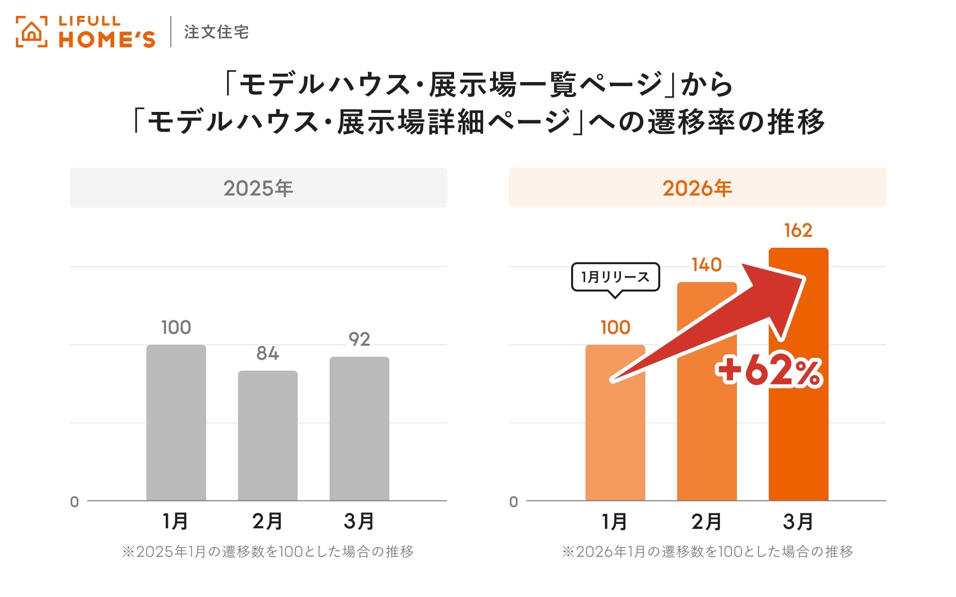 サイトリニューアル後の2026年1〜3月において、LIFULL HOME'S 注文住宅の「モデルハウス・展示場一覧ページ」への流入ユーザー数は増加し、1月から3月にかけて+53%と大幅に伸長しました。また、「モデルハウス詳細ページ」への遷移率は同期間で+62%と大きく上昇しました。